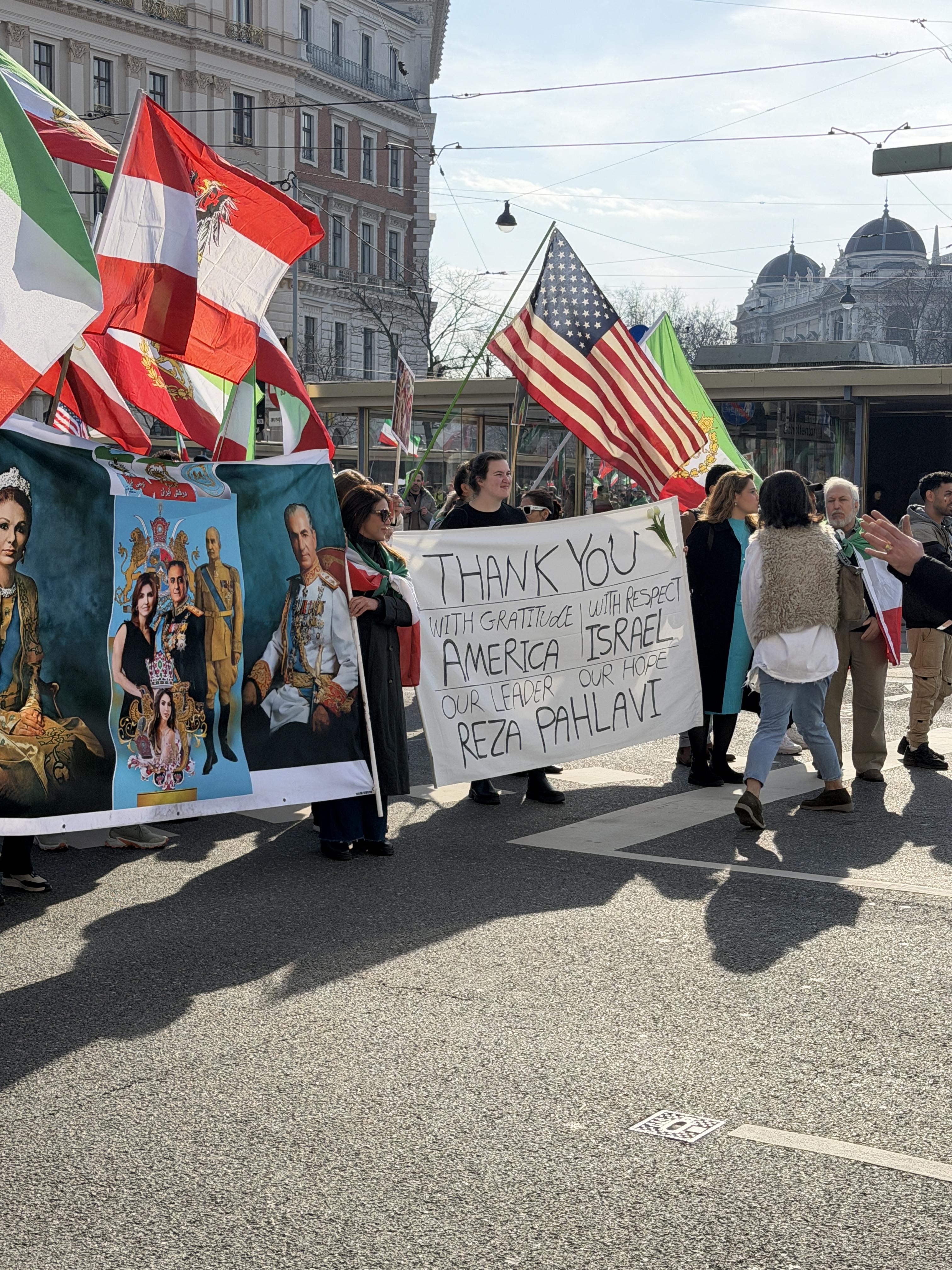 When the crowd reached my street, I noticed dozens of Iranian flags, along with a few Israeli and American flags. As the march moved closer, I could finally read some of the signs. A few said, “Thank You, Mr. Trump” and “Thank you with gratitude America, with respect Israel, our leader, our hope, Reza Pahlavi.” This caught me completely off guard. I had assumed I was watching a protest, but instead it seemed like a celebration, or demonstration of support.