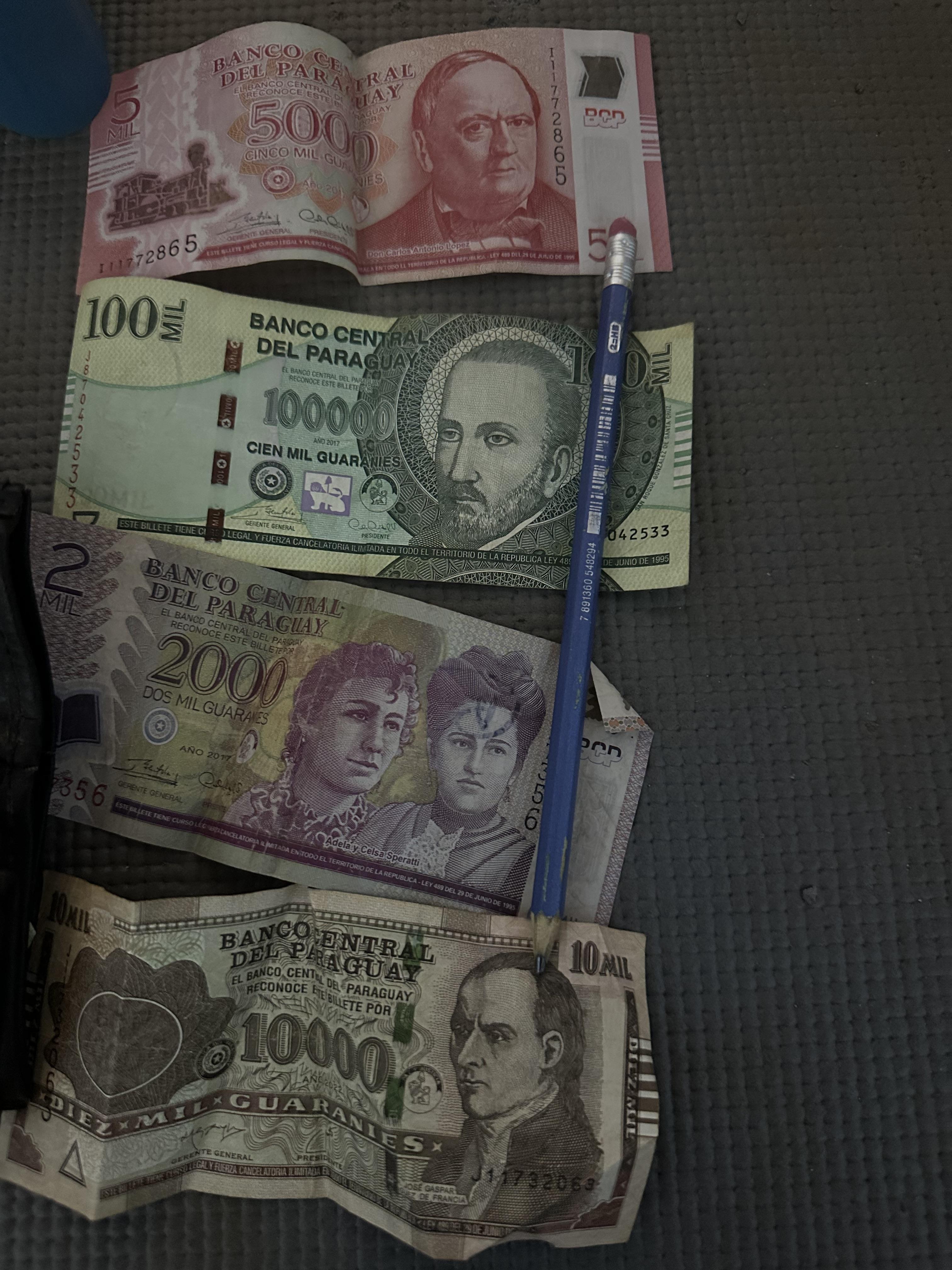 The currency in Paraguay are called guaranis, too. One U.S. dollar is equivalent to about 7,000 Guaranis. The bills used here are 2,000, 5,000, 10,000, 20,000, 50,000,and 100,000 notes. The coins are 50 (never used), 100, 500 and 1,000. A credit card is also widely accepted in most places, especially in the city.