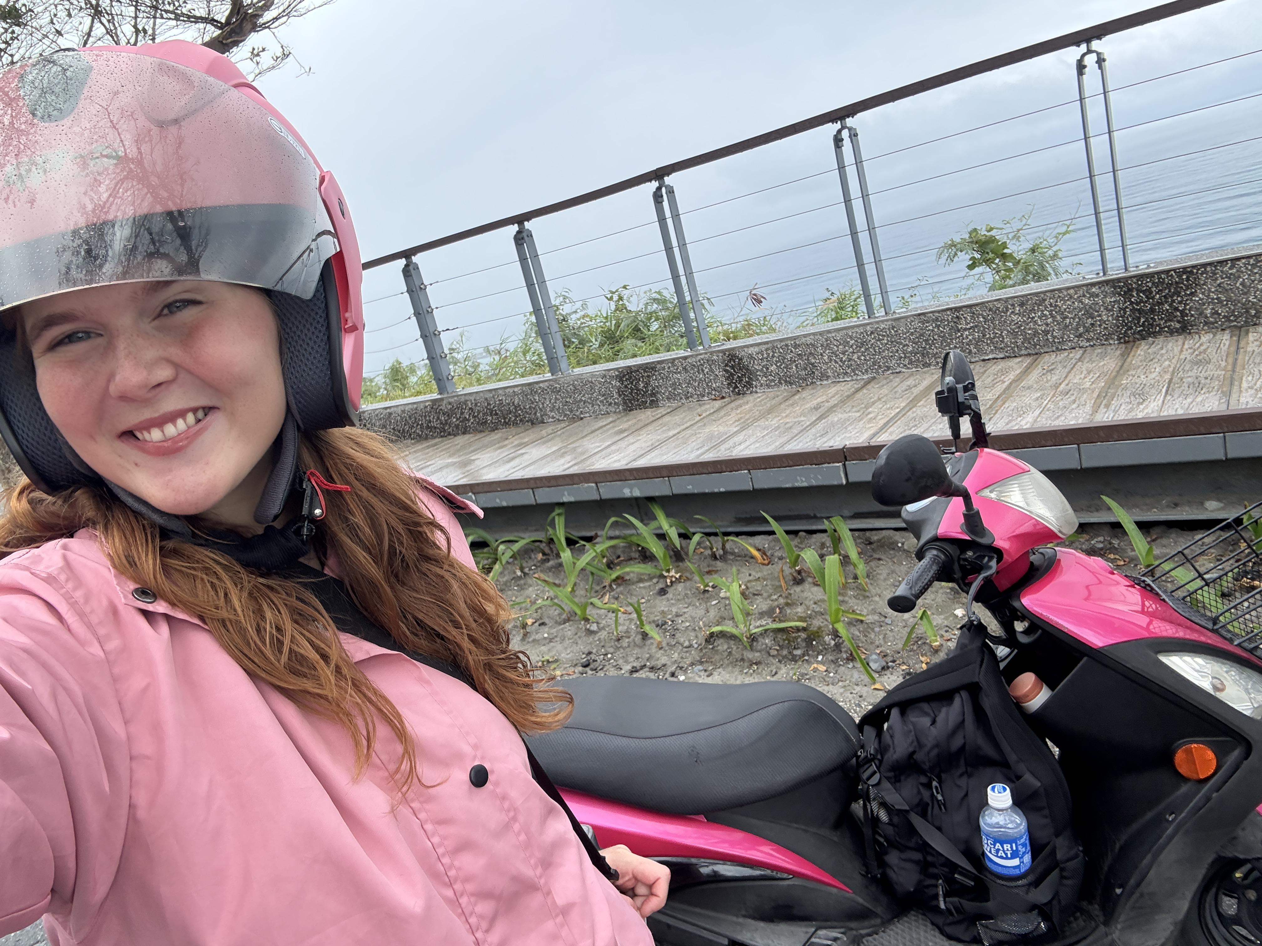 On my scooter! My scooter’s name is Barbie. I had her taken to the shop before I set off on my journey to make sure she was in tip-top condition.