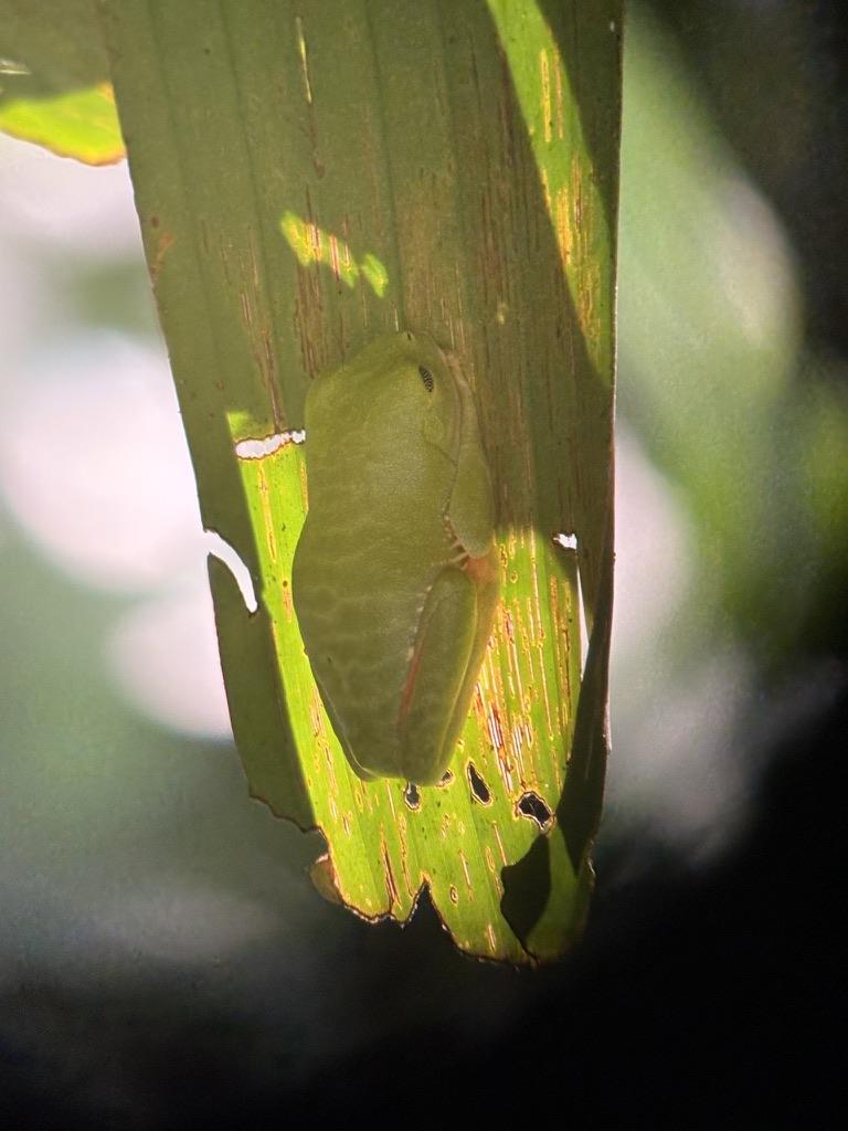 We saw some great examples of mimicry, including a bird called a Common Pauraque. This bird has feathers that look similar to the scales of a snake, so that predators will avoid it. There were also several frogs that blend in so well with the leaves and become almost invisible. We also saw and another tiny frog taking advantage of a tiny hole in the trunk of a tree. It was impressive that the guides were able to spot them!