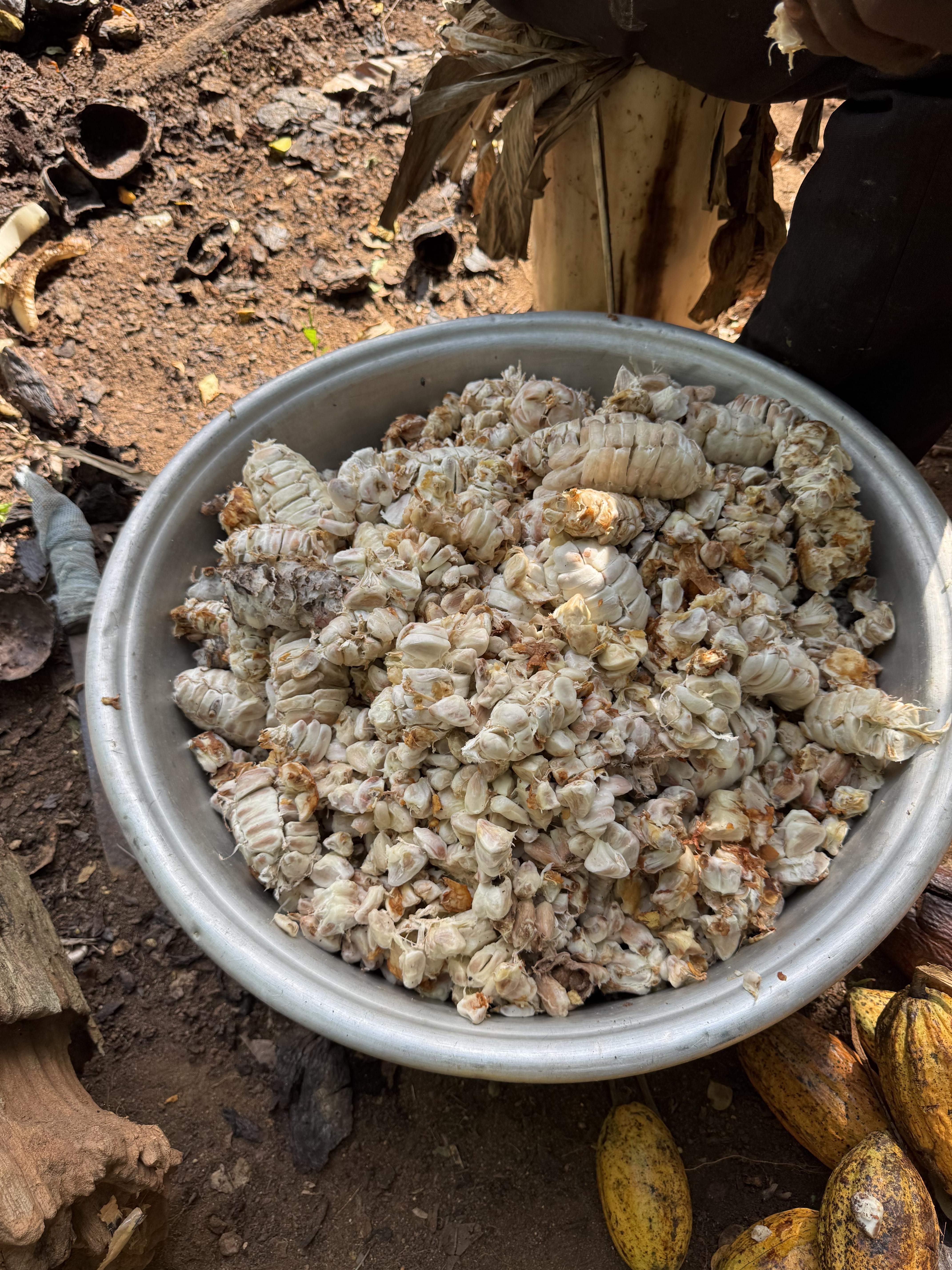 This week I tried eating the cocoa pulp. To eat cocoa pulp, you just suck or slurp it off the seeds. It tastes a little fruity, kind of like a mix between mango and pineapple. I had to be careful not to bite the seeds. Those taste bitter and earthy like a mix of coffee and dirt. Yuck! You can only eat cocoa pulp when it is fresh, right after you cut the pod open. If you wait too long, it goes bad and tastes sour.