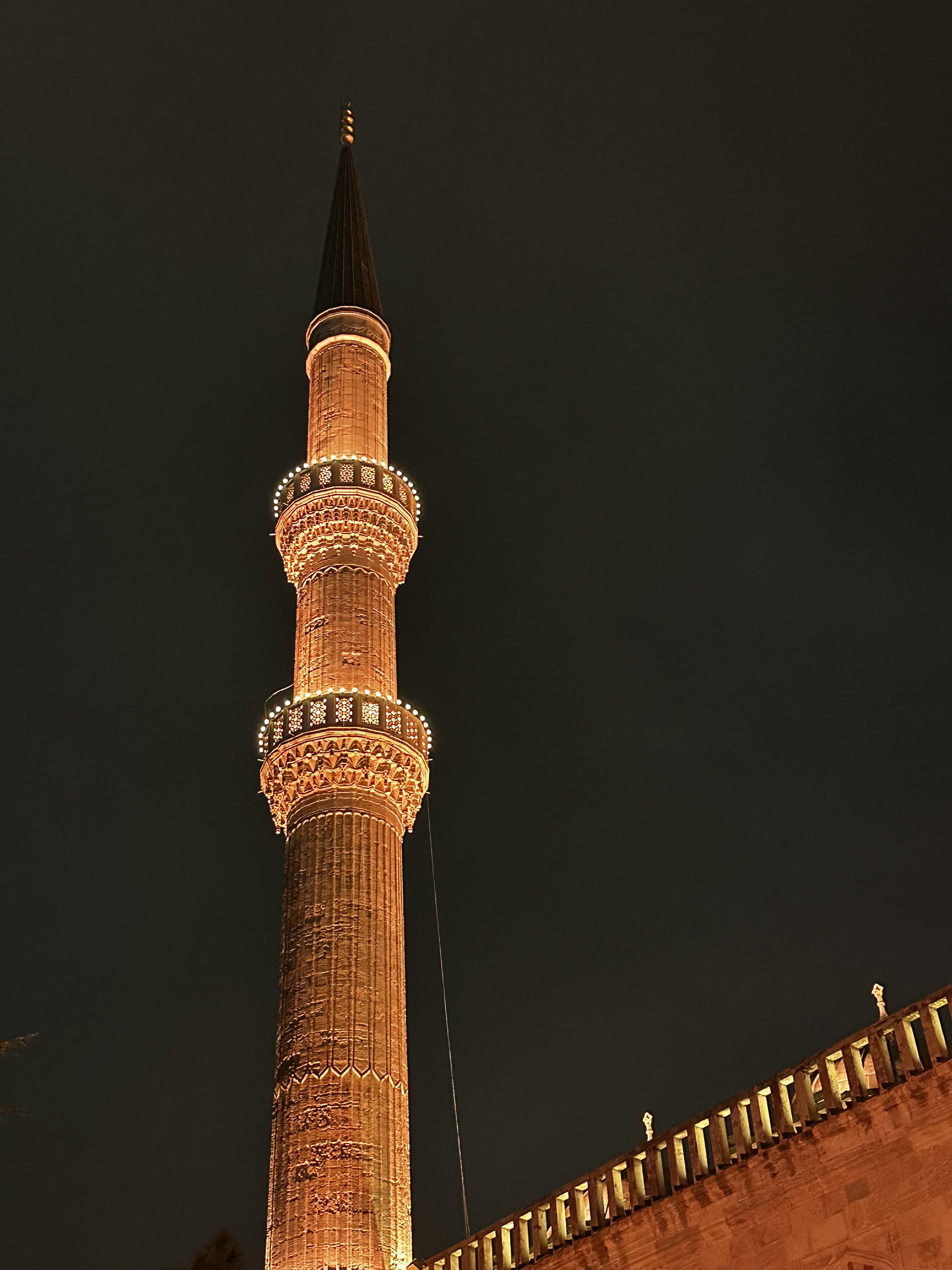 A minaret is a special tower near a Mosque. They used to climb these tower so that more people could hear the call to prayer, but now they have speakers so they're just for decoration.