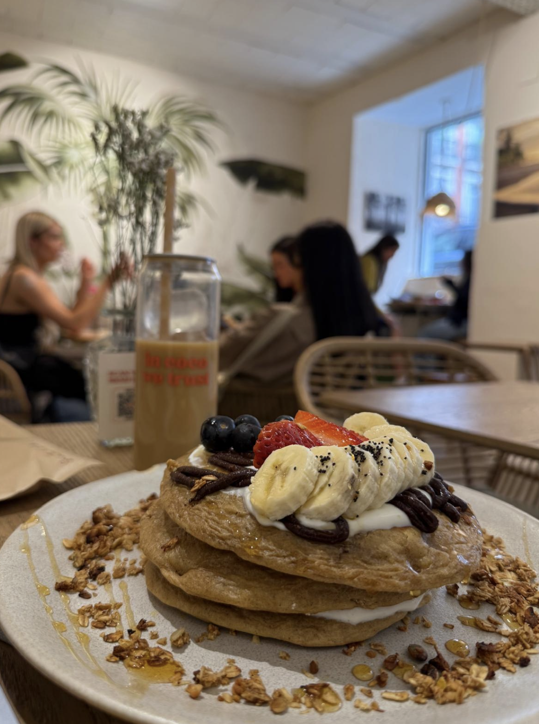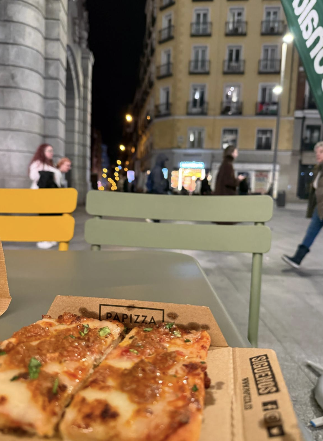 The photo with the pizza shows a pizza boloñesa (Bolognese pizza) with a tomato sauce base, minced (ground) beef, olive oil and parsley. I am seated at the Metro Gran Vía plaza, a popular tourist area. The coconut pancakes at the café in the image remind me of some of my favorite pancakes at home. The picture with my laptop shows me working on homework while eating a turkey, pesto and arugula sandwich. On another occasion, I had some delicious dumplings at a restaurant near my apartment while getting over a cold, as shown in the last photo on this page. Finally, I was quite surprised to see a Stranger Things pizza at the grocery store!
