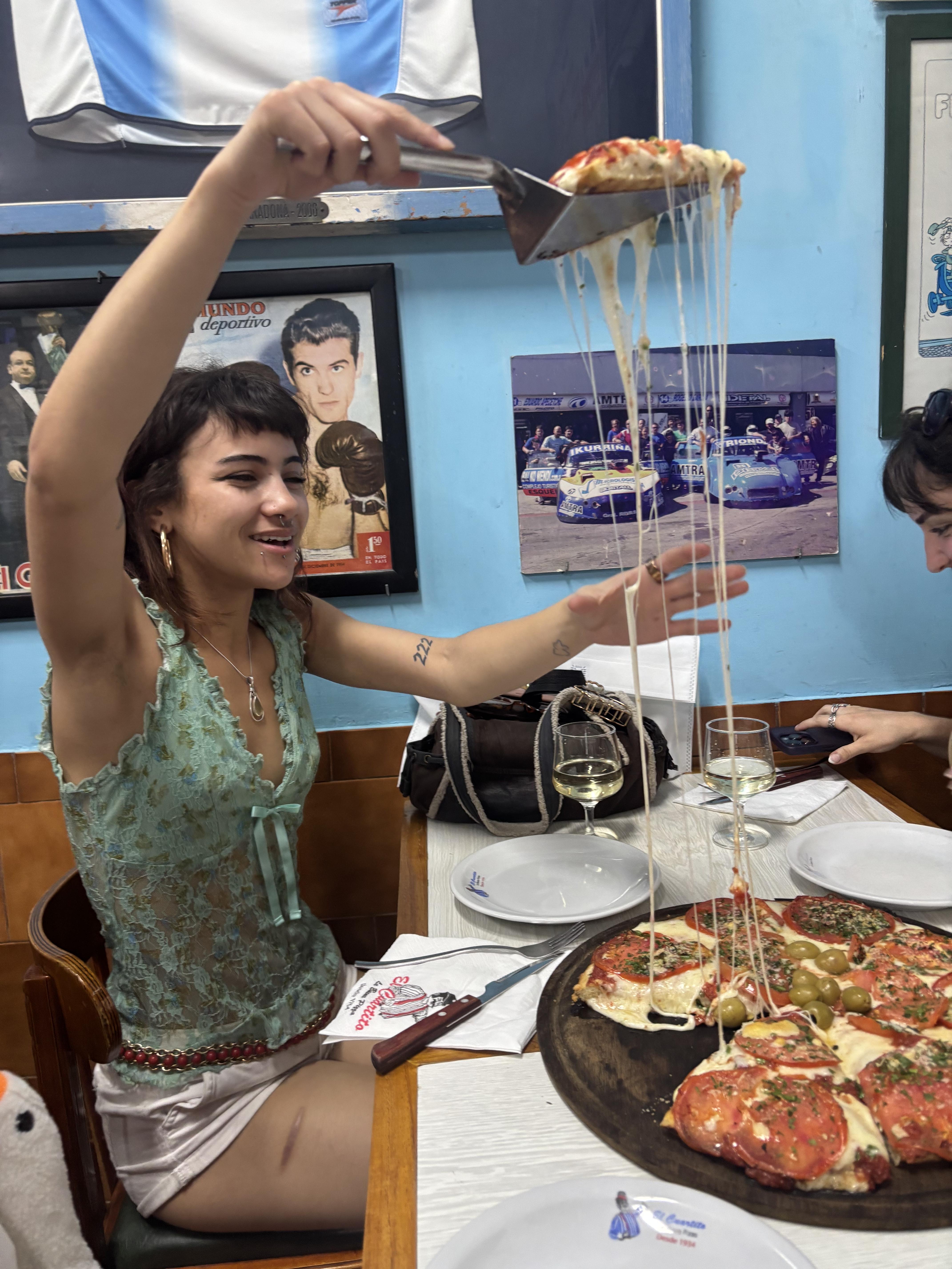 ¡Hola a todos! Ya completé mis primeras semanas en Buenos Aires y me ha encantado explorar la gastronomía que ofrece esta ciudad. Mucha de la población de aquí son descendientes de inmigrantes europeos entonces hay muchas opciones para comer. Buenos Aires es una ciudad muy transitable. Puedes caminar a casi todas tus destinos o usar el Subte (el metro subterráneo de Buenos Aires) o bus. Yo uso mucho la línea B del Subte porque me lleva directamente de Villa Crespo, el barrio donde yo vivo, a Recoleta, donde está CIEE. Cuando voy a tomar mis clases en CIEE, me bajo en la parada Uruguay. Desde ahí, camino 10 minutos y paso por unos cafés muy ricos. Mi café favorito es un lugar llamado Flamingo. Hace un latte delicioso y tiene unas galletas con chispas de chocolate muy exquisitas. Recientemente, fui con amigas a una famosa pizzería llamada El Cuartito. Está muy cerca de CIEE, solo caminamos como tres minutos. Adentro tenían fotos y camisetas firmadas por futbolistas argentinos famosos. También tenían colgados premios que había ganado en el pasado por la calidad de su pizza. Era un restaurante muy vivo y alegre, con música y mucha gente hablando y riendo.