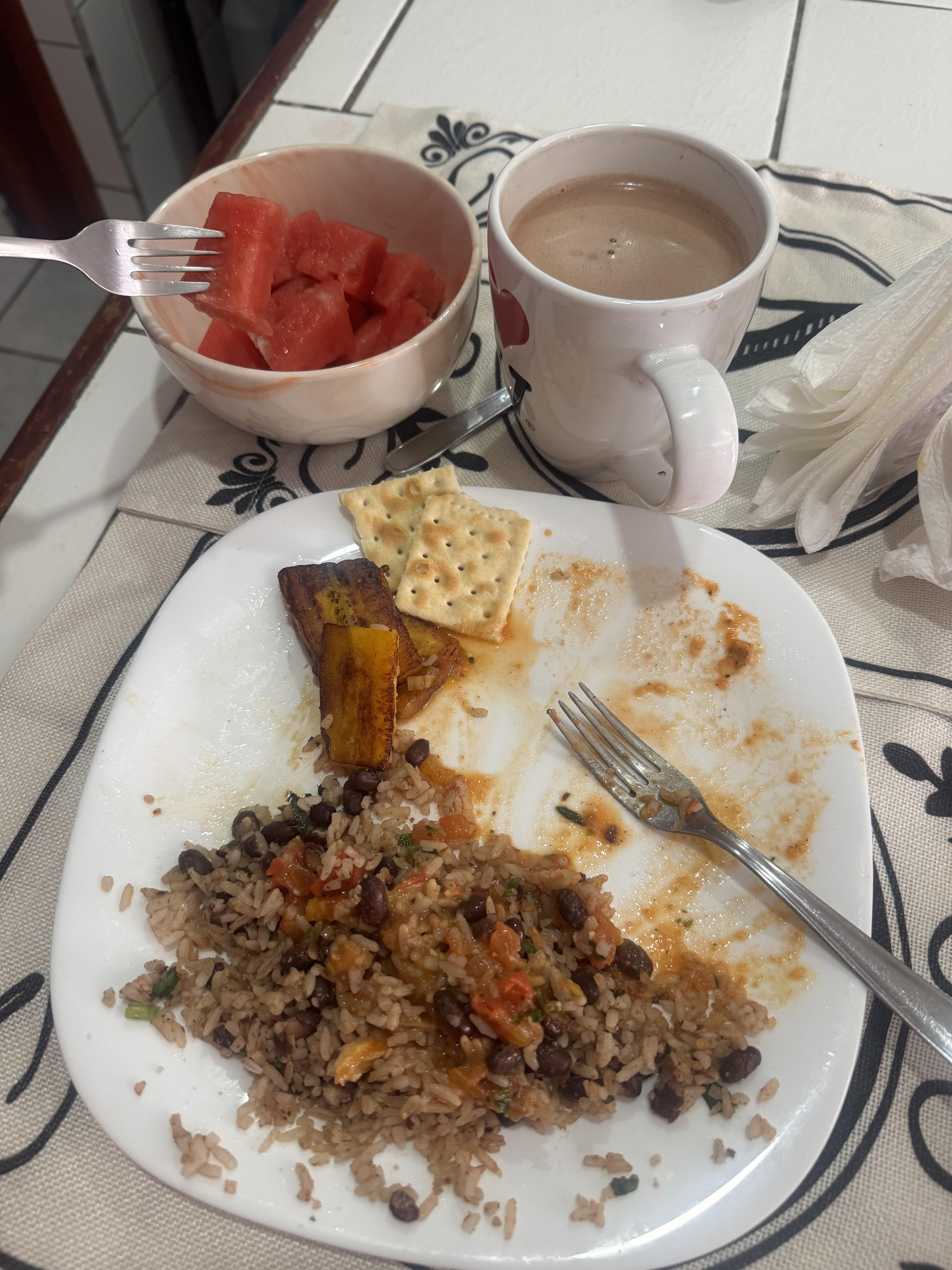I have tried many types of new food since I have been in Costa Rica. I have tried their most popular food, gallo pinto (a variation of rice and beans). I have also tried yuka (potato-like), maduro (plantains), chifrijo, Caribbean rice and beans (they use coocnut milk to make it!), empanadas, guava, orange watermelon, starfruit, sour mango, variations of oranges and much more.