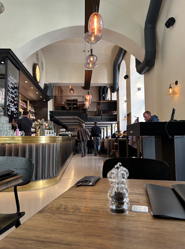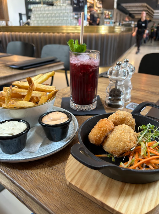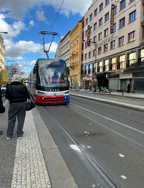 Today, I took a tram to a local restaurant recommended by one of my professors. (Trams are vehicles that travel along rails and are powered by overhead wires.) I sat down and ordered a traditional Czech dish, fried cheese. This fried ripened cheese, Olomoucké tvarůžky, was coated in breadcrumbs and came with a small fruit salad and a side of fries with chipotle mayonnaise dip. I also ordered a homemade blueberry lemonade because freshly made drinks are very popular in Prague!
