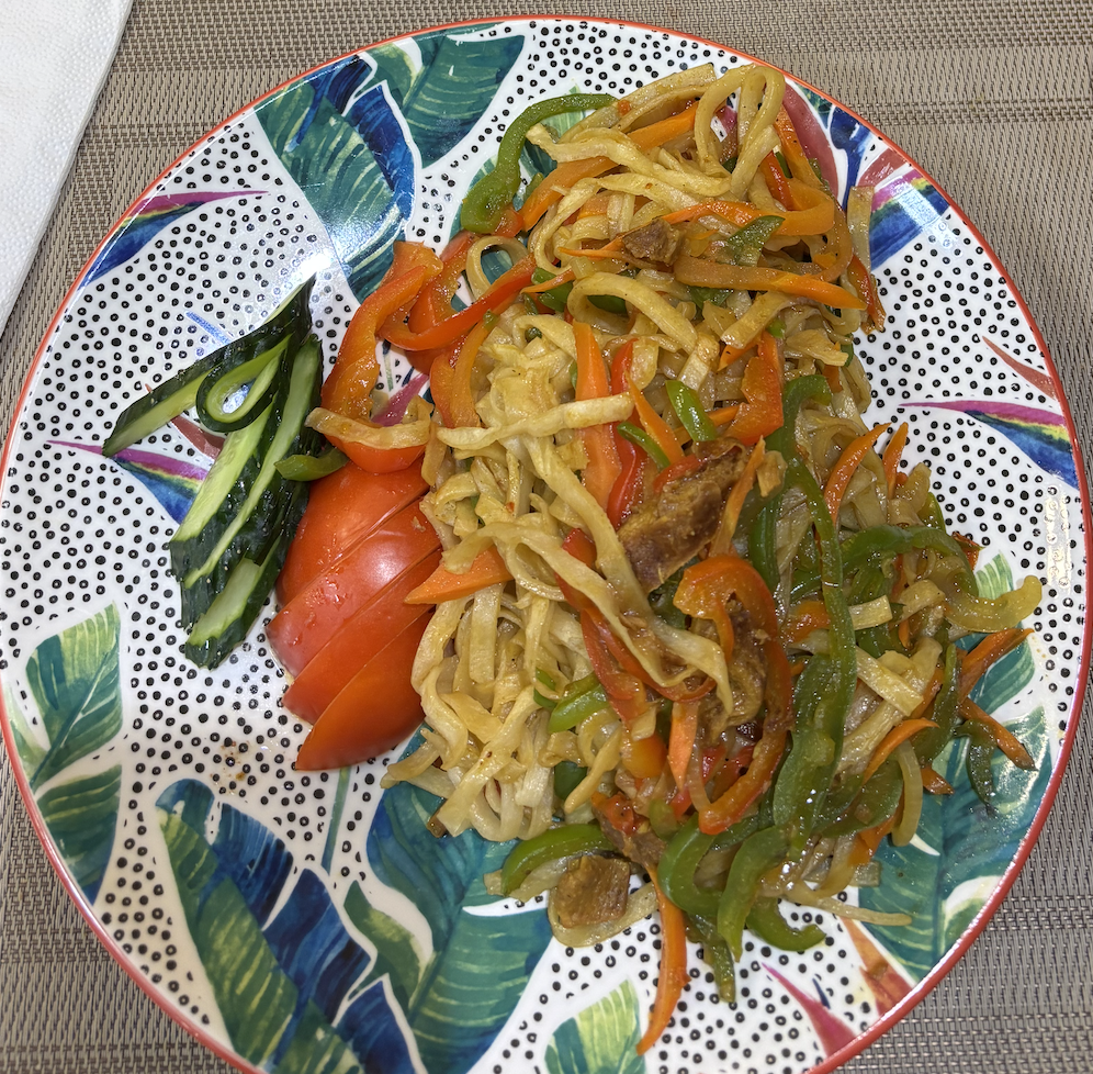 Here is how цуйван (tsuivan, noodle dish), my current favorite Mongolian dish, is prepared. Tsuivan is made by cooking homemade noodles together with meat and vegetables in one pot. First, dough is made from flour, water and a little salt. The dough is rolled out thin, lightly oiled, folded and cut into long strips. Next, beef or mutton (sheep meat, or lamb) is sliced and fried in oil in a large pan or pot. Onions are added first, followed by vegetables such as carrots, cabbage or potatoes. The noodles are then placed on top of the meat and vegetables. A small amount of water is added, and the pot is covered so the noodles steam rather than boil. After a few minutes, once the noodles soften, everything is mixed together and lightly stir-fried. Although the dish is seasoned simply, usually with just salt, it is unlike any stir-fried noodle dish I’ve had, and I’ve tried many!