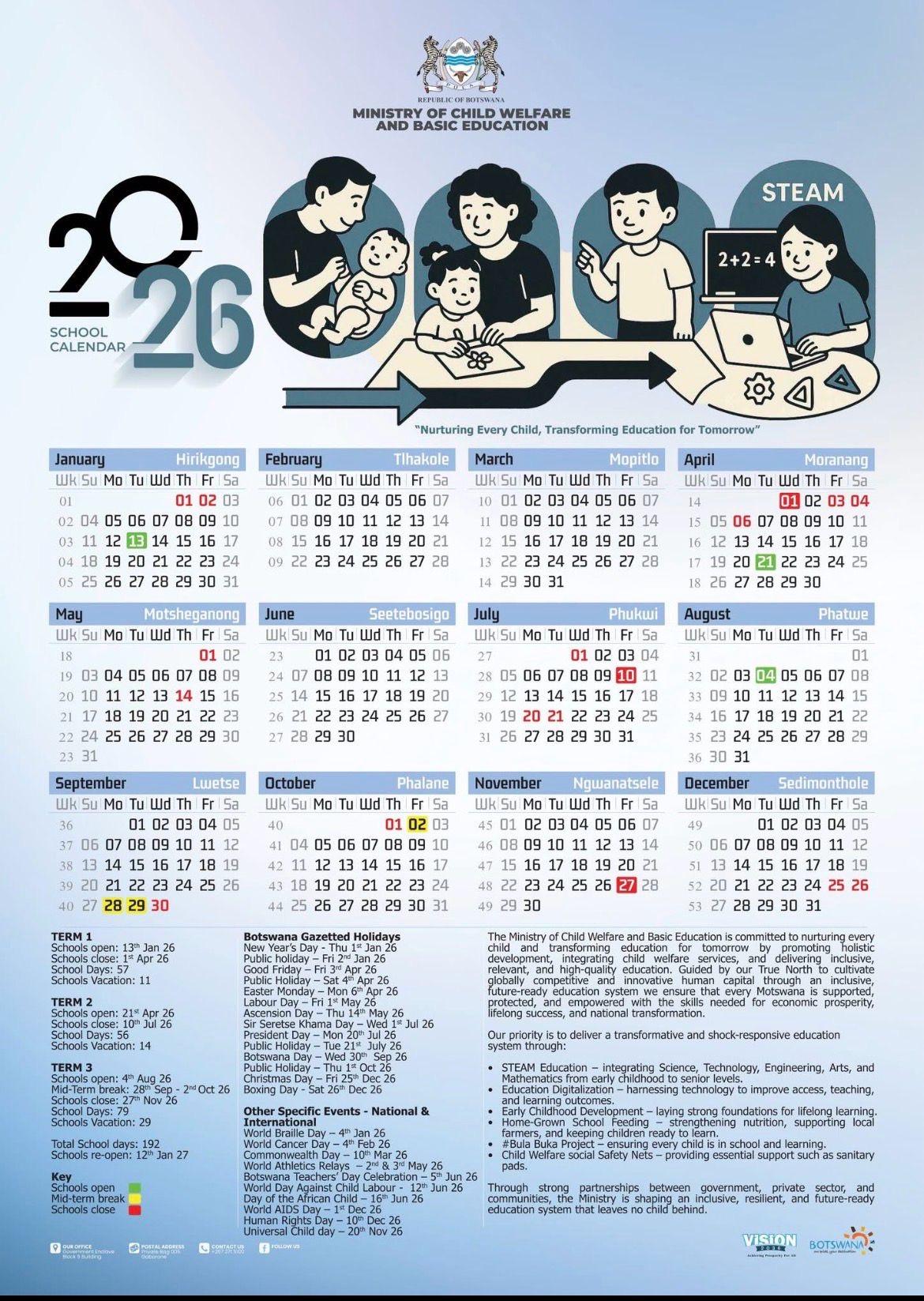 Overall, the students have school from January to March. April is a midterm break, then they go back to school until June. July has a midterm break as well. Then, they are back in school from August to November, with a break in December. This means that students will go to school in May and June, where students in the U.S. are typically done with the school year around this time. This means that Botswana students go to school all year round.