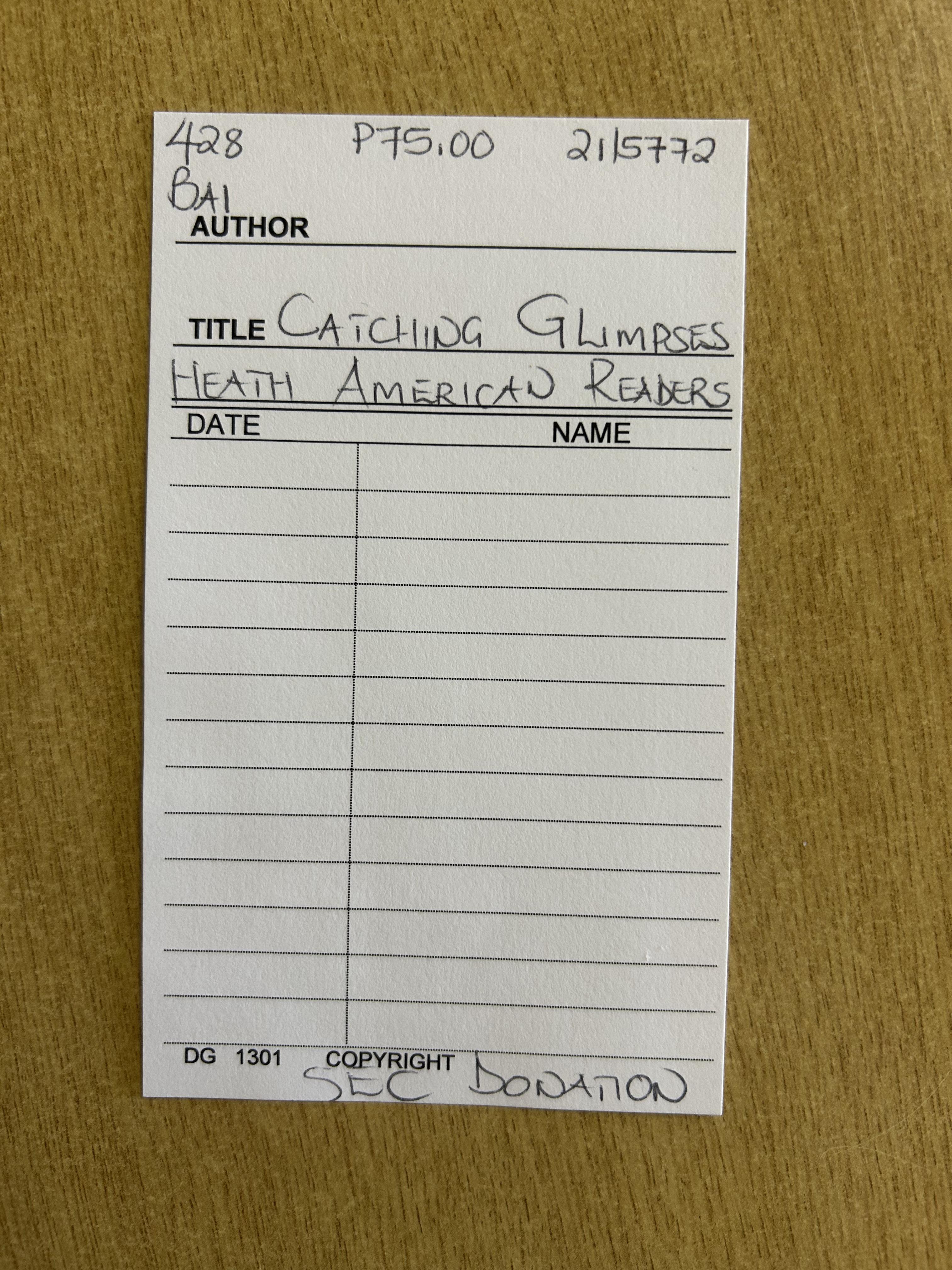 When a student checks out a book, they write their name and class on this book card, and we also stamp the return date on the book card