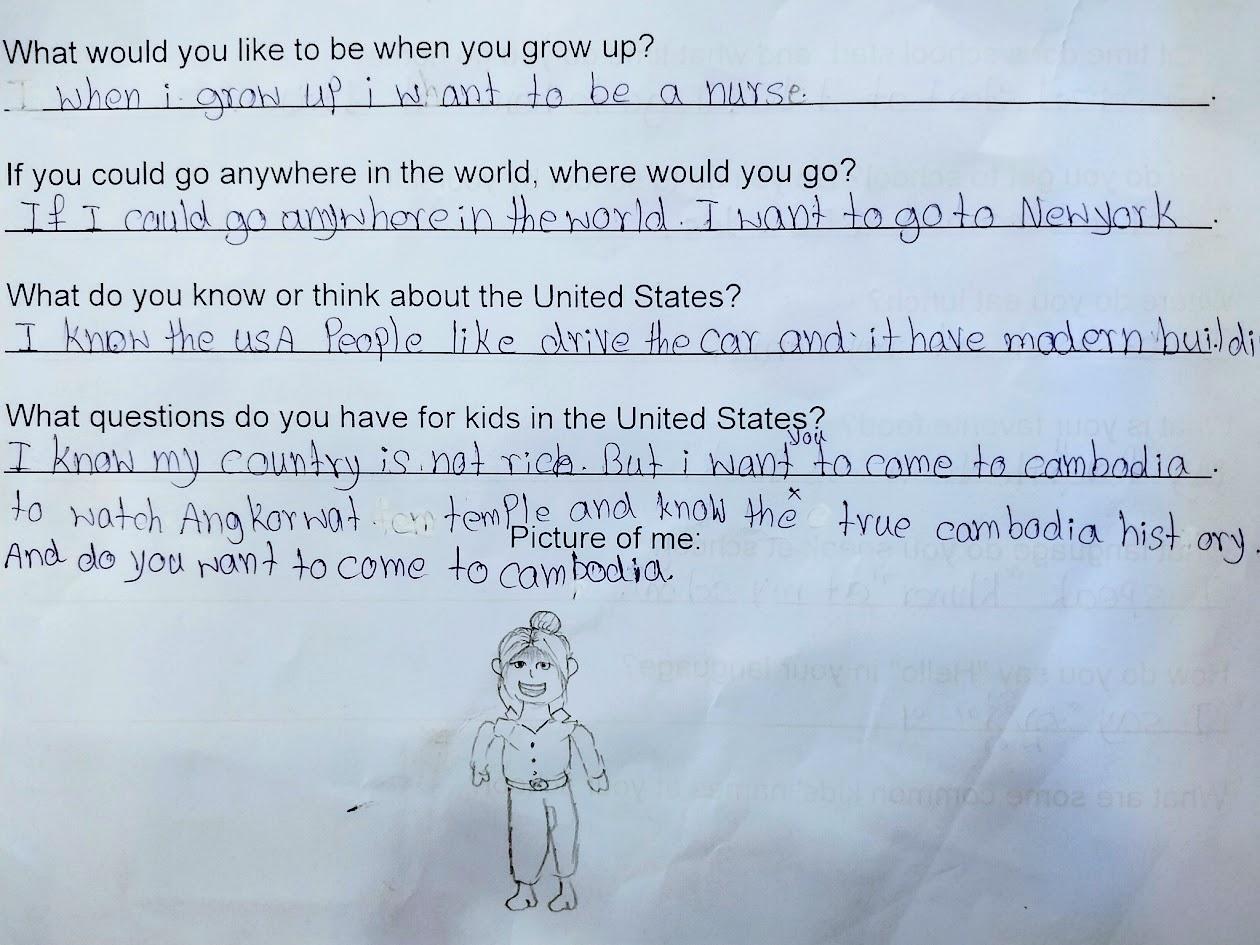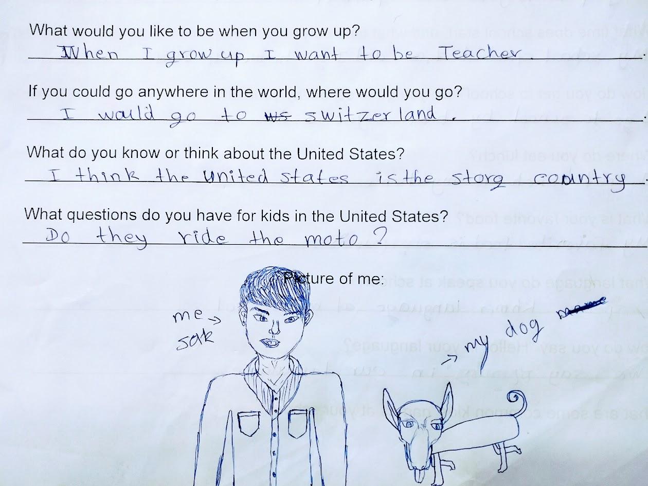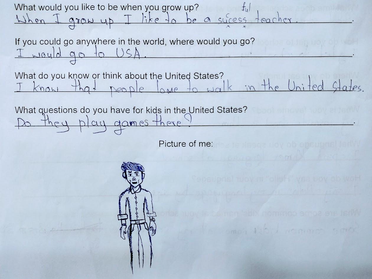 Every Thursday evening, I teach at a community English club hosted at my church. I teach students from Grade One to Grade Twelve. Usually, my students are the ones asking me questions about my life, but this time, I asked my students questions about their lives! Each student was given the same questions, and then they came up with their own answers. Some answers were similar, and some were unique. I hope you enjoy getting to know my students as much as I have!