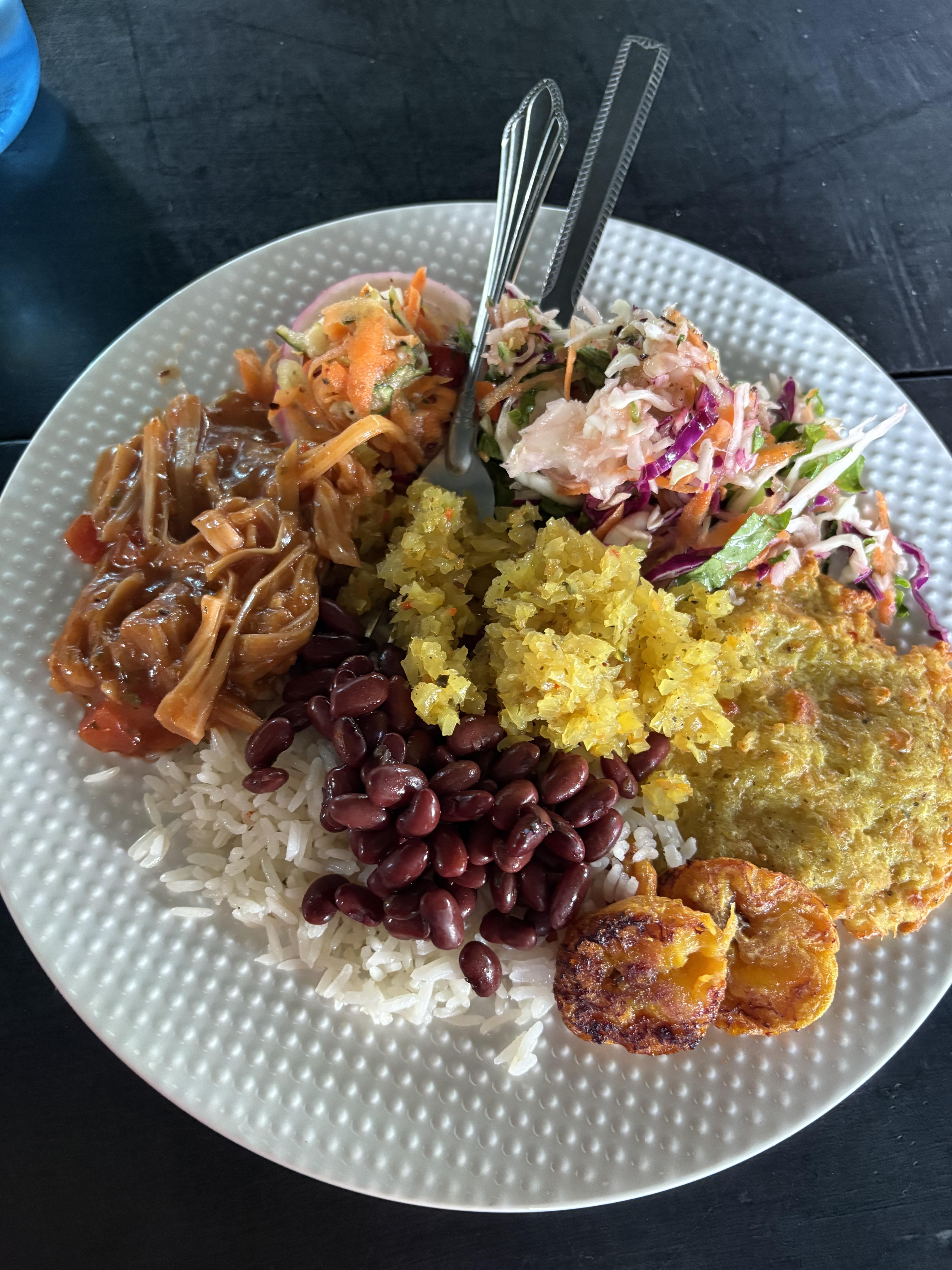 The best meal this week was vegetarian! It was rice, beans, salad, sweet plantains, green papaya and jackfruit with red sauce.