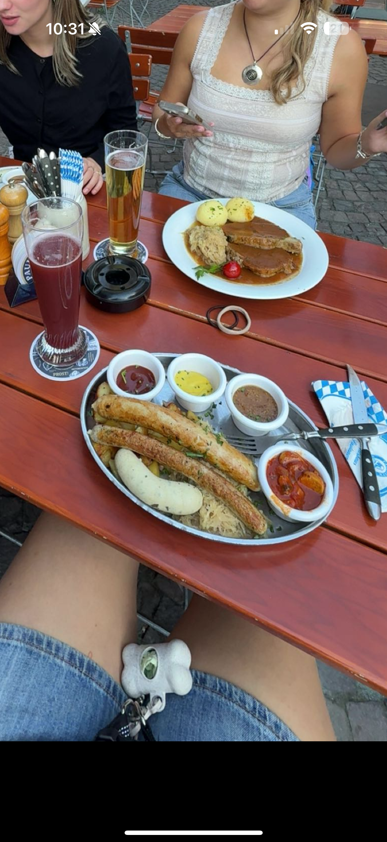 After a long day shopping and walking, it was time for dinner. Another very common meat dish in Germany is essentially a platter of different types of Wurst. The plate I had included a Bratwurst (fried sausage), Weißwurst (white sausage), Currywurst and a mystery-wurst! They also come with Sauerkraut, which is a traditional German side dish made of fermented cabbage. It was very good and very filling!
