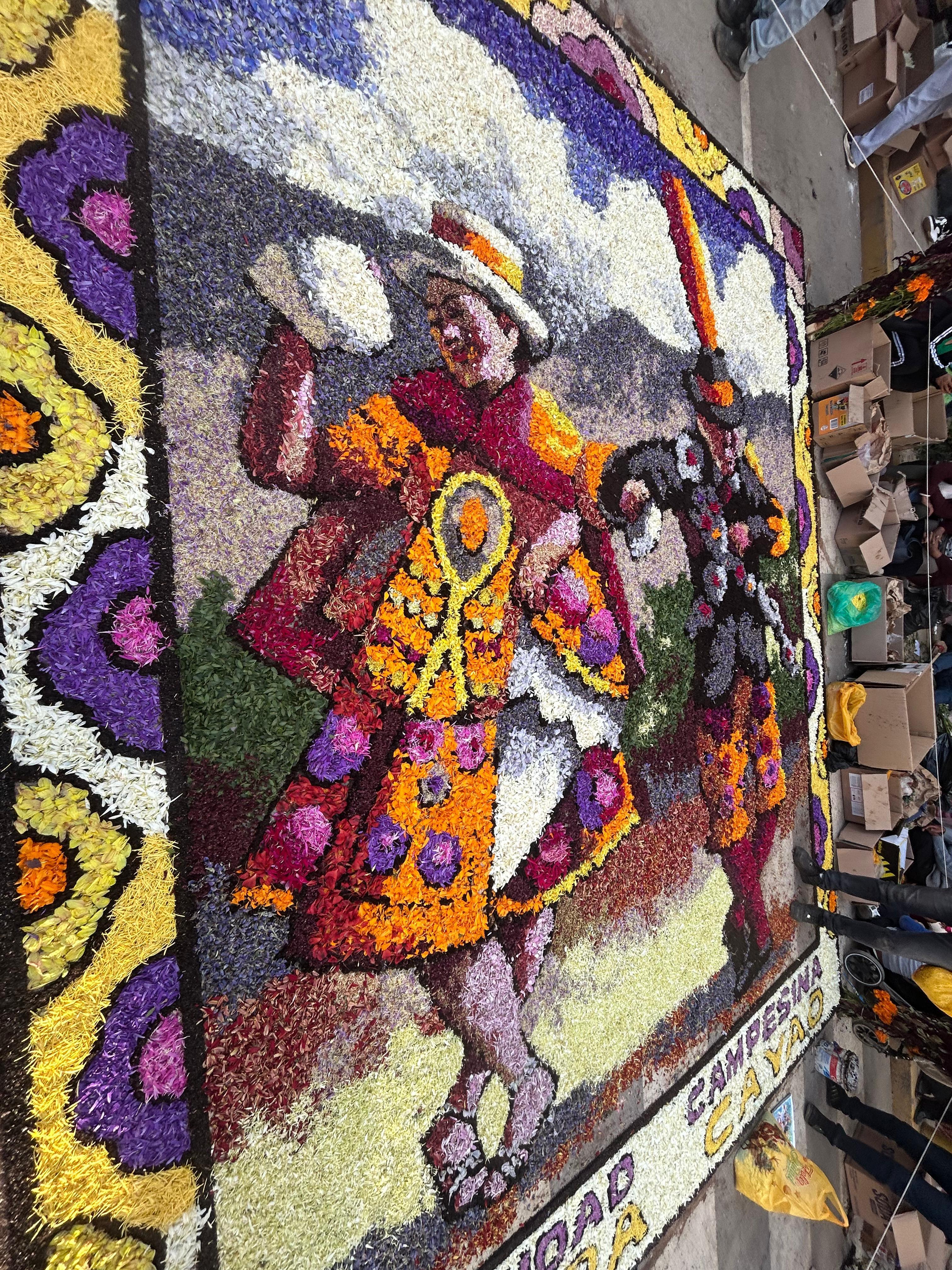 For Semana Santa, which is the week-long holiday leading up to Easter, I visited Tarma about an hour away. They have an amazing custom where they make artwork of a kind of paint-by-numbers using flower petals. Different groups from within and around Tarma get a section of the plaza to create their artworks, which usually represents something from their community like a special dance, an animal or a unique location.