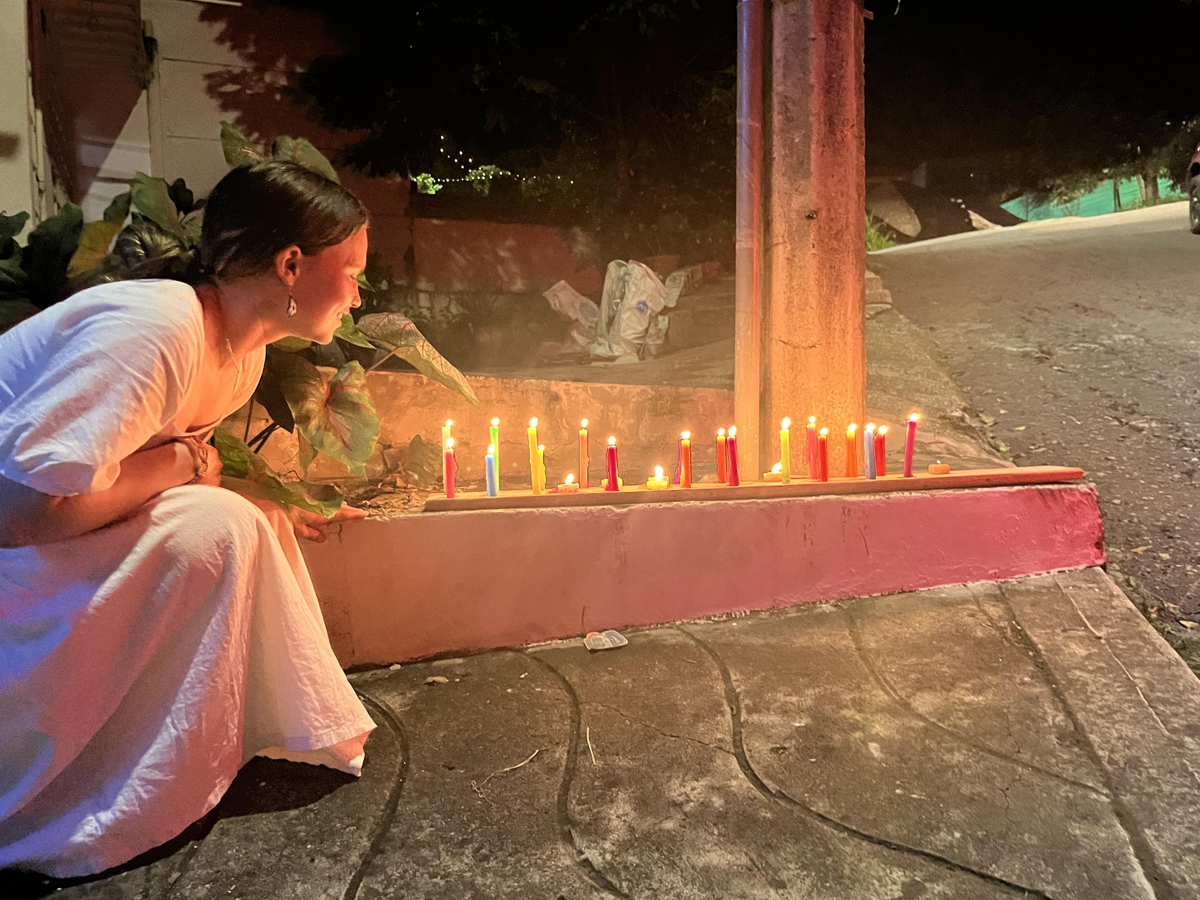 Yo aprendí sobre una tradición que se llama el Día de las Velitas. Es una tradición que sucede el 7 de diciembre, cuando los colombianos se reúnen con familia y amigos y prenden velas en las calles de su pueblo o ciudad. Normalmente preparan una buena cena y toman vino o cerveza. Depende de la región; después de la cena y después de prender las velas, la gente baila. A veces, si es una comunidad muy extrovertida, la gente va al centro del pueblo, al parque, y hacen una fiesta allí. En casi todos los pueblos hay un parque en el centro con una iglesia. La alcaldía de la comunidad decora el parque con luces y decoraciones para la Navidad. Muchas veces esta es la primera noche en la que prenden las luces del parque.
