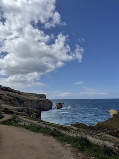 The most interesting place I visited this week was Tunnel Beach. To reach it, you hike down a steep path and then walk through a hand-carved tunnel that leads to the ocean. When you come out of the tunnel, you are surrounded by tall sandstone cliffs and crashing waves.