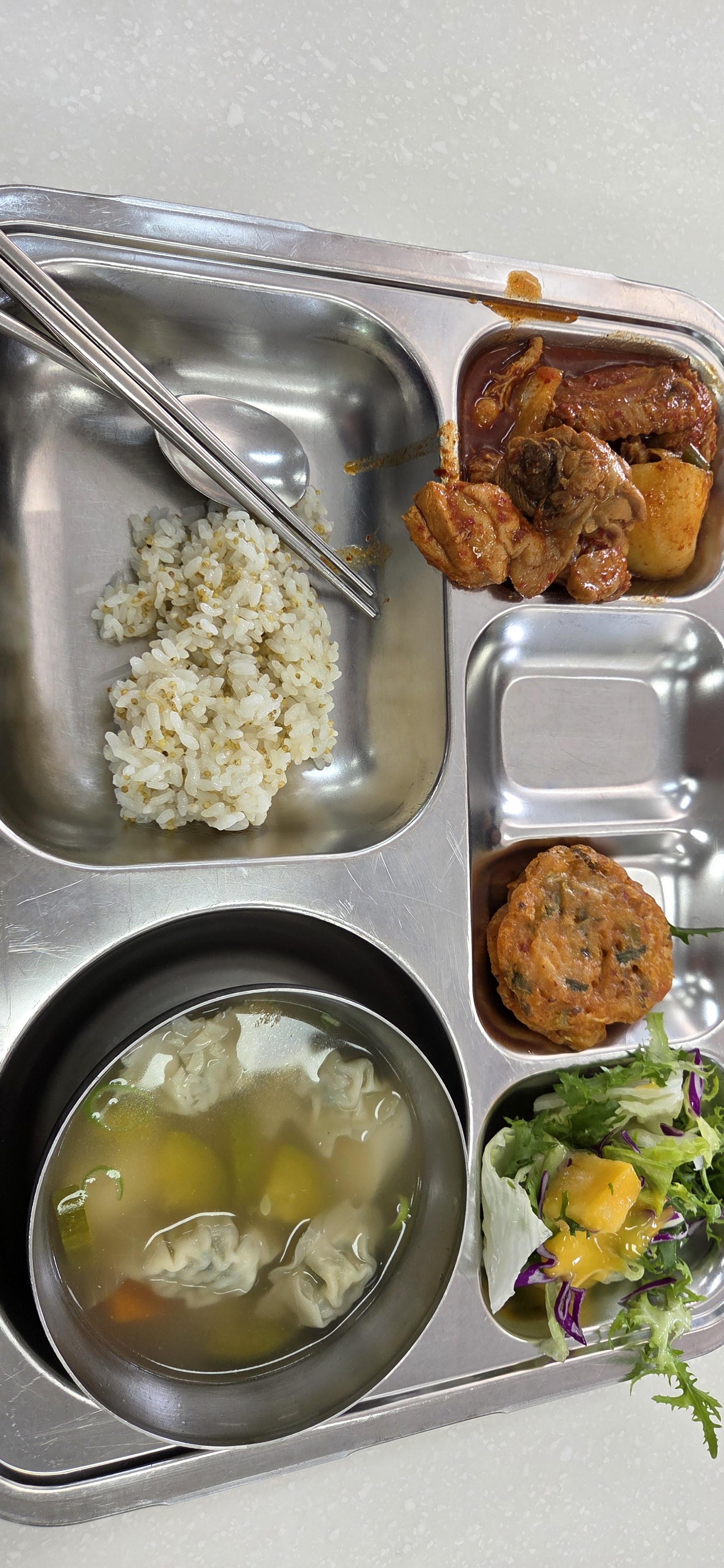 Our school cafeteria is run by a nutritionist and multiple cooks who make the food for over 600 people every day. They also make dinner for the students who stay after school to study more. When you walk into the cafeteria, you get in line to grab a tray, chopsticks and a spoon. Then, you walk over to the giant bowls of cooked rice, where you can serve yourself as much rice as you want. After you get your rice, you line up in front of the kitchen, where the cooks serve you the main parts of the meal and your soup. In South Korea, rice, soup and kimchi are the staples of the meal. Finally, there is another self-serve station where you can grab kimchi, salad, and the treat for the day. They usually have some sort of drink or small dessert with the meal.