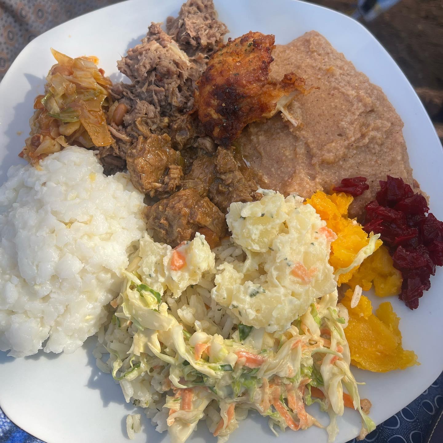 I tried many different foods coming to Botswana. Palache or pap is the common starch made from maize meal which many people eat with soup or stew. Samp is also a common food usually mixed with beans for some protein. The diet in Botswana is mainly meat and carbs. Seswaa is pounded meat which can be from a cow or goat. Additional sides are mashed butternut squash, beetroot, and coleslaw.