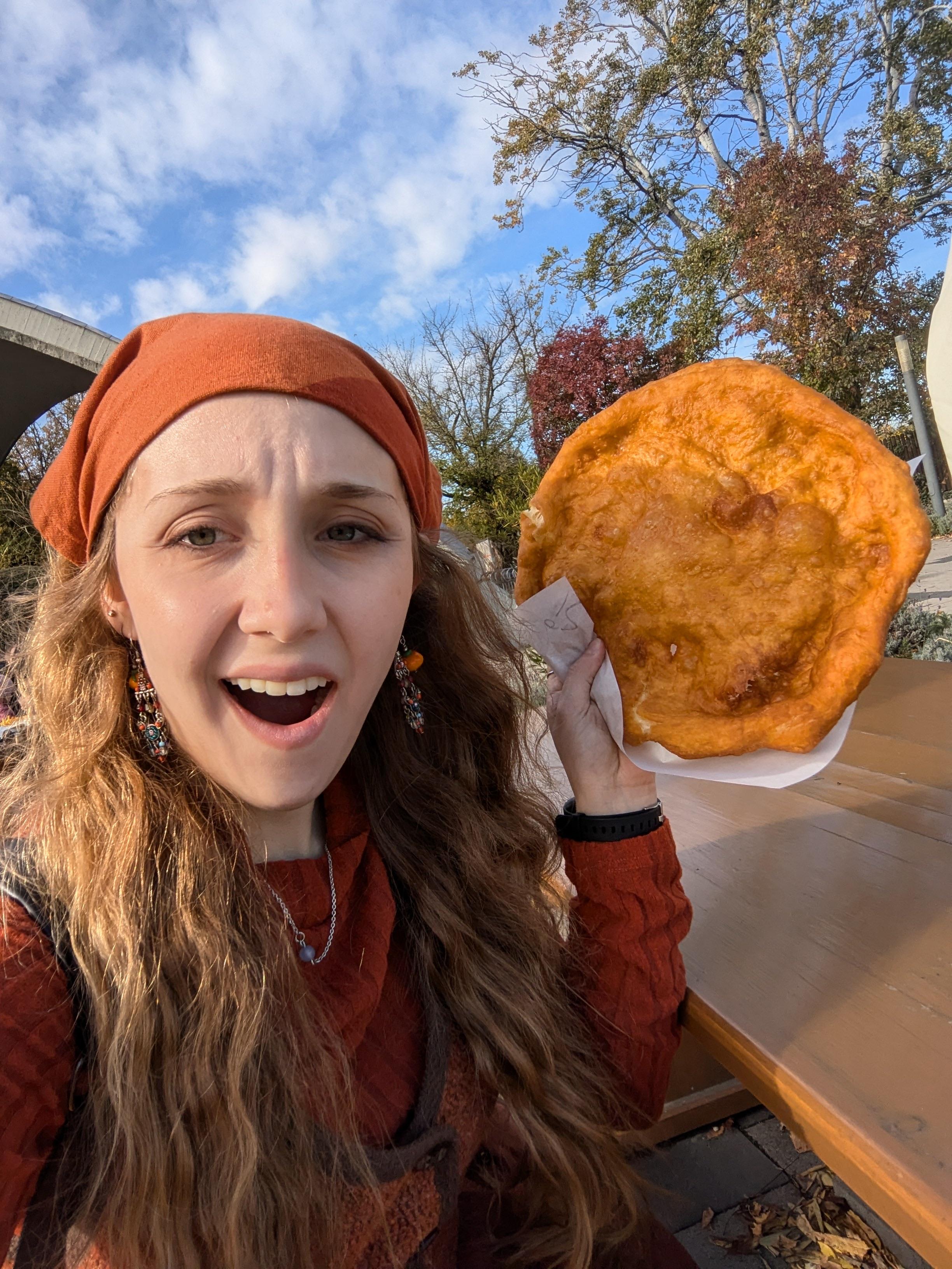 My favorite meal was when I got to try langos for the first time! Langos is a traditonal Hungarian food that is deep fried bread often topped with sour cream and cheese. I got mine plain and it was so warm it melted in my mouth, almost like a savory funnel cake. It was almost the size of my head and I did my best to eat it all, though it would be a great food to share with a friend.