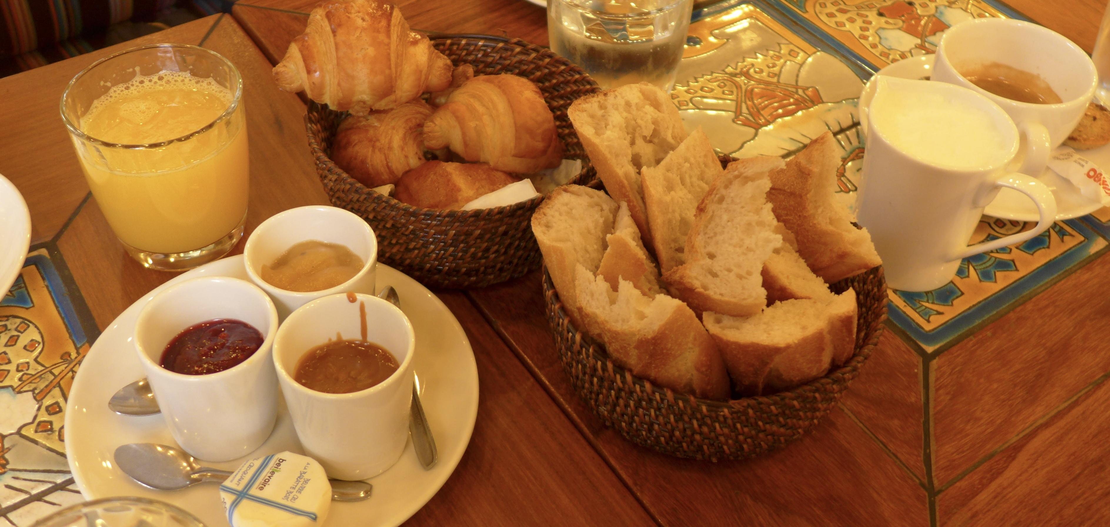 The pain au chocolat, crepe, and baguette are typical foods from boulangeries (bakery), always fresh and made with simple ingredients like dough, butter, and chocolate. The mussels are served in a big bowl, cooked and mixed with coarsely chopped thyme, mint, and parsley leaves. The dessert Merveilleux is made of meringue, which looks very sweet but is not. The coffee is served in the smallest cup they can find, and is very strong, like a shot of espresso.