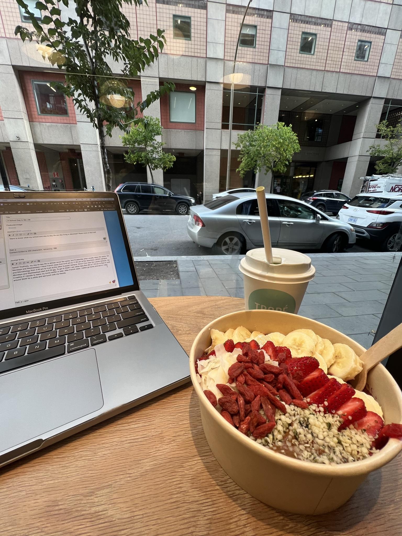 On Monday, October 16, when I was writing this post, I happened to miss Bus 66, so I had to take Bus 51 and metro lines green and orange. I had a meeting at 12 p.m., so I stayed around SGW and finally ate an açaí bowl at a little cafe I had been wanting to visit! I also took the shuttle for the second time to save some commuting time, and it only took 15 minutes to get from SGW to Loyola! After attending the lecture, I went home to change into gym clothes and then walked to the gym to warm up before working out. Once I got home, I ate dinner, studied for an upcoming test, and then went to bed!