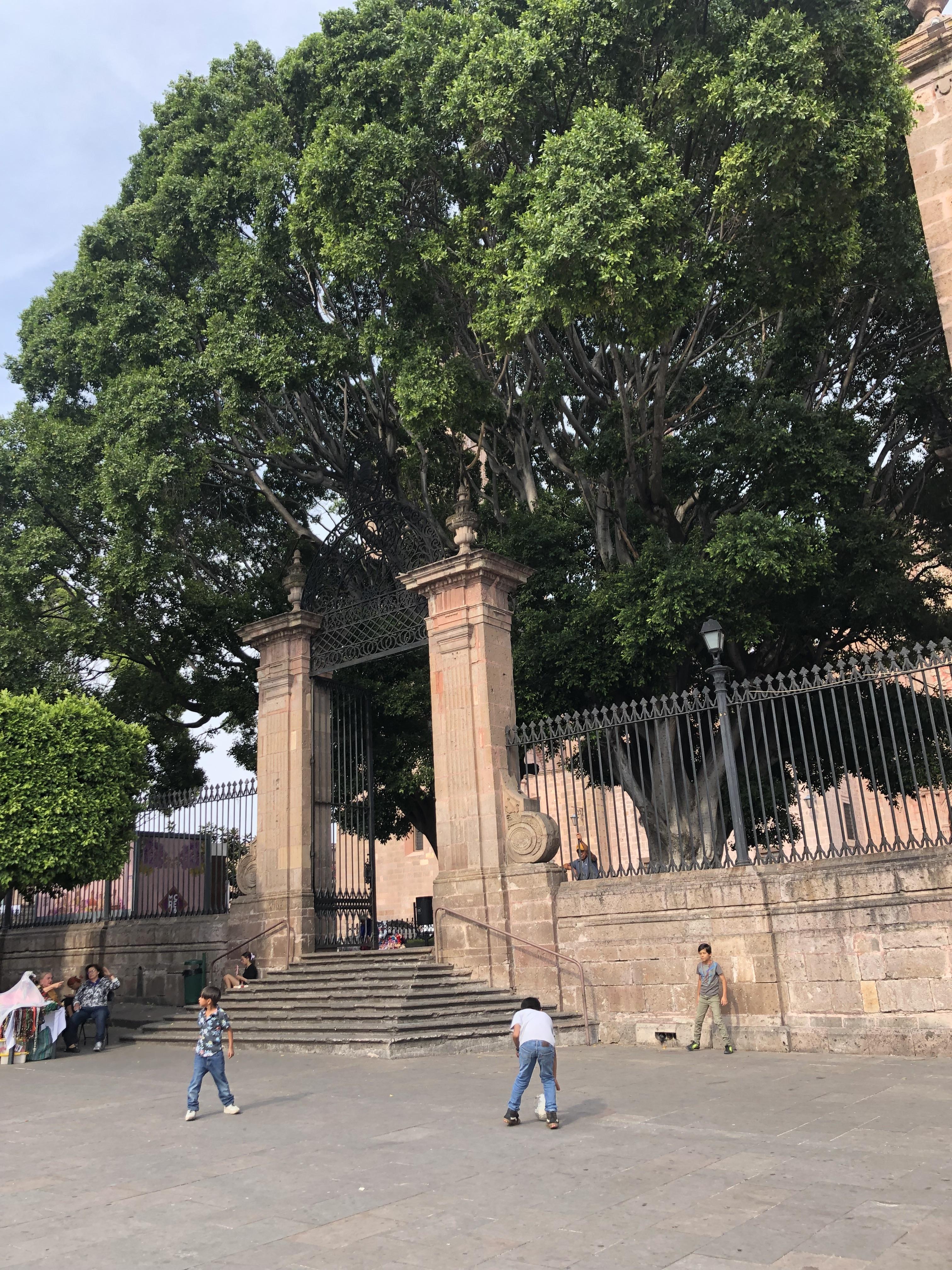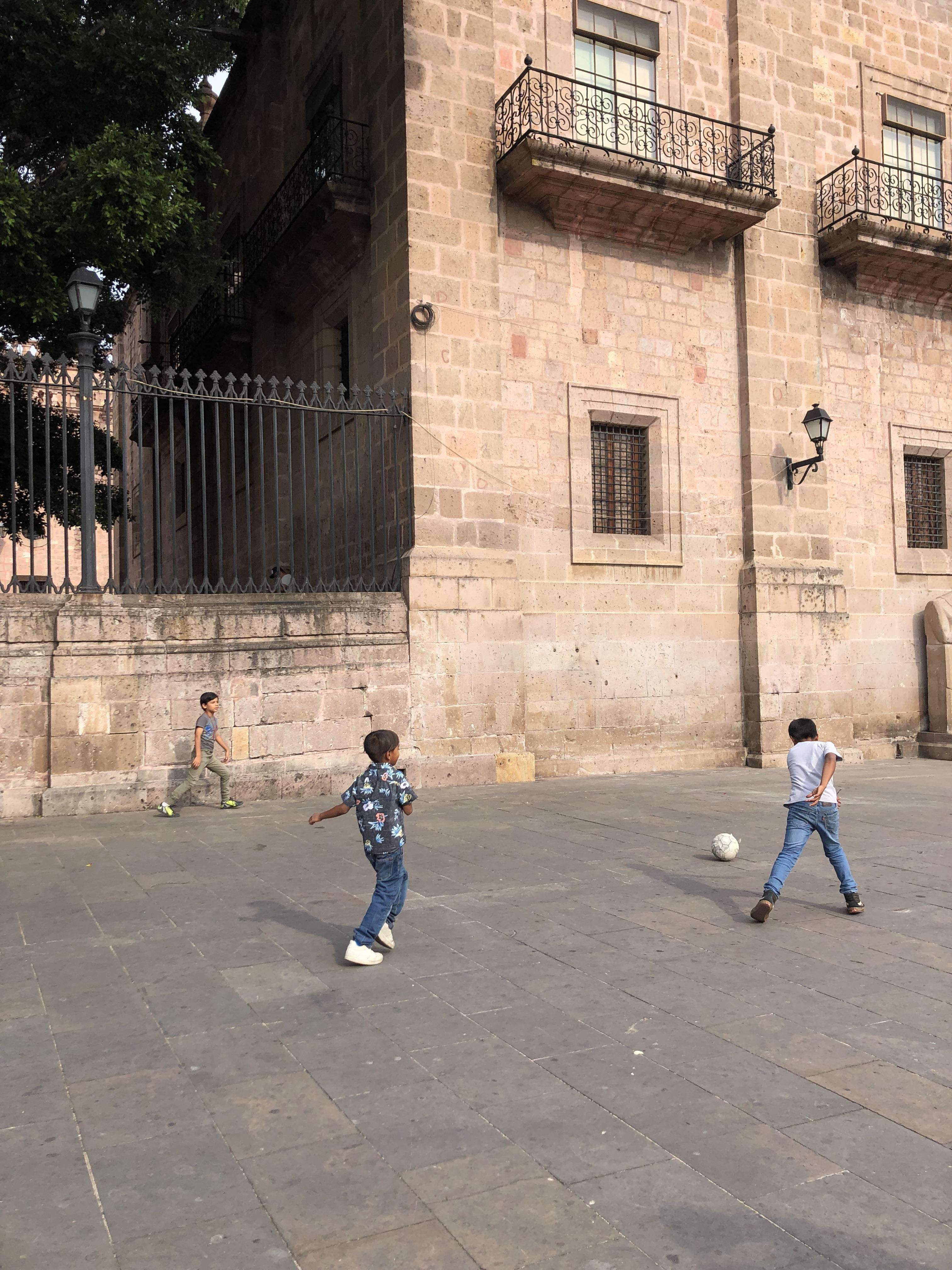 People like to gather in plazas and parks to play a round or two of soccer. I often see groups of kids or adults playing soccer when I walk around the city.Just this afternoon, I went on a walk in downtown Morelia, a city in the state of Michoacán. We visited the beautiful cathedral, and just outside, there were three boys playing soccer.