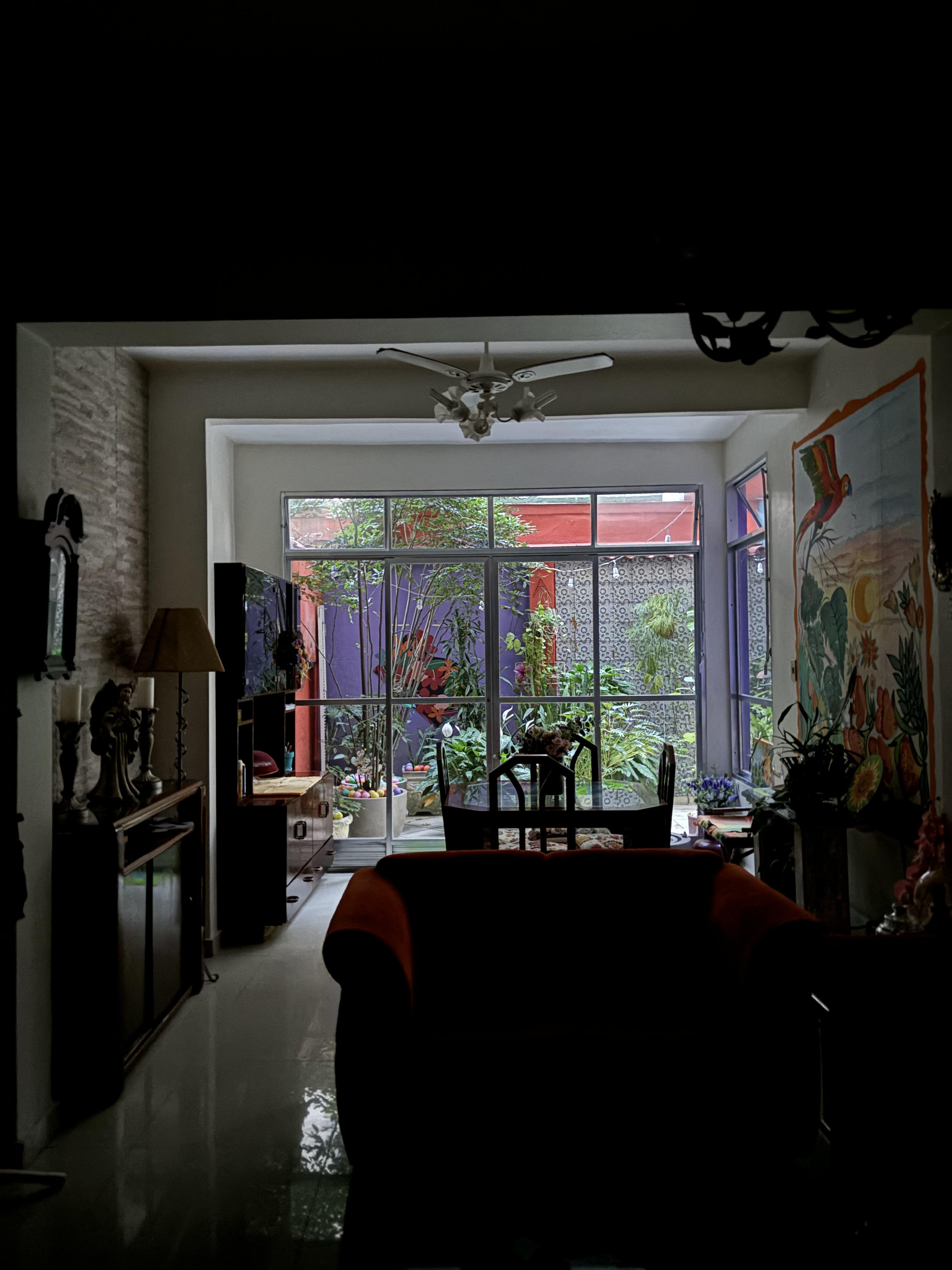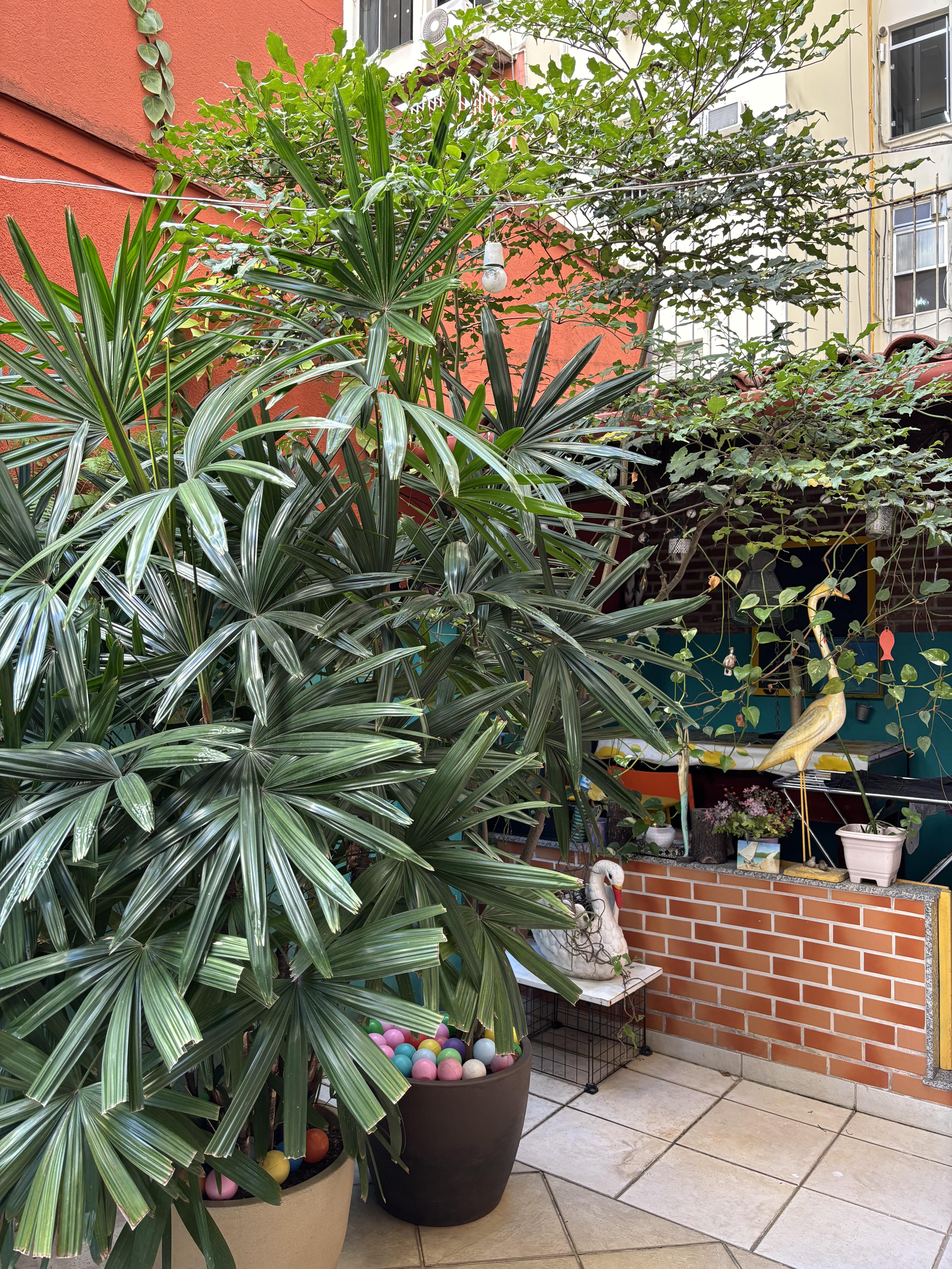 Ana lives in Copacabana, just one block from the beach, close enough to feel the ocean breeze. Her apartment is colorful and full of personality, with a bold orange sofa that immediately catches your eye. It's also really comfortable! The space feels eclectic but homey, filled with art, books and little decorations she’s picked up over the years. The best part is her patio, a lush jardim overflowing with mature plants that make it feel like a tiny forest or park. It’s where she spends her mornings drinking coffee and reading, while her cat, Francisca, stretches out in the sun. Francisca loves the garden, especially when sun hits it.
