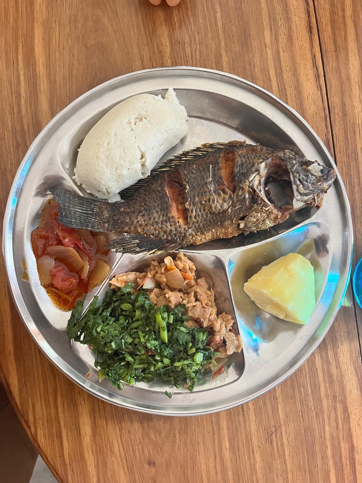 To make nshima, ground maize is added bit by bit to boiling water and stirred thoroughly to make smooth lumps that look like very thick mashed potatoes. It's usually really hot and I've looked silly a few times burning my fingers on it. When it isn't too hot, you pinch off a bit, roll it around to make a ball and dip it into the relish. The relish is cooked seperately from the nshima. Just remember to add lots of salt when cooking it!