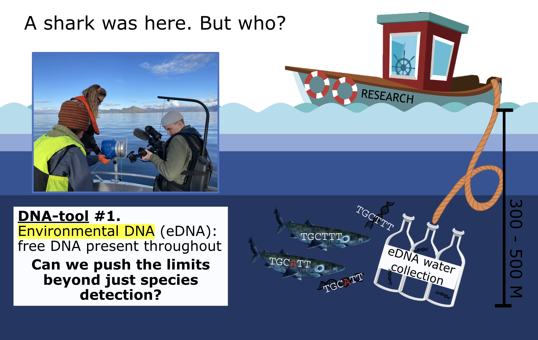 In this journal article, I will explain my first DNA tool in more depth. When water sampling, we use a capture device that we drop, let float down and trap water at a certain depth. With the environmental DNA (eDNA) floating in these water samples, I hope to determine if our species of interest, the Greenland shark, is present in the fjord, but I would also like to push these DNA tools further. I want to say that the shark DNA in the sample belongs to one shark family or multiple. What could co-occuring, unrelated individuals in the same sample tell us? Why would a tool like this be exciting for scientists? Specific and personal information like this will be needed to make informed, real-time conservation decisions in the future.