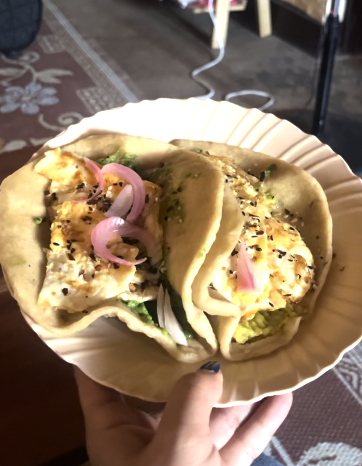 I made breakfast tacos this week for dinner twice! I use a torilla-like bread called chapati and added avocado, eggs, everything-but-the-bagel seasoning that I brought from America and some pickled red onions that I made last week.