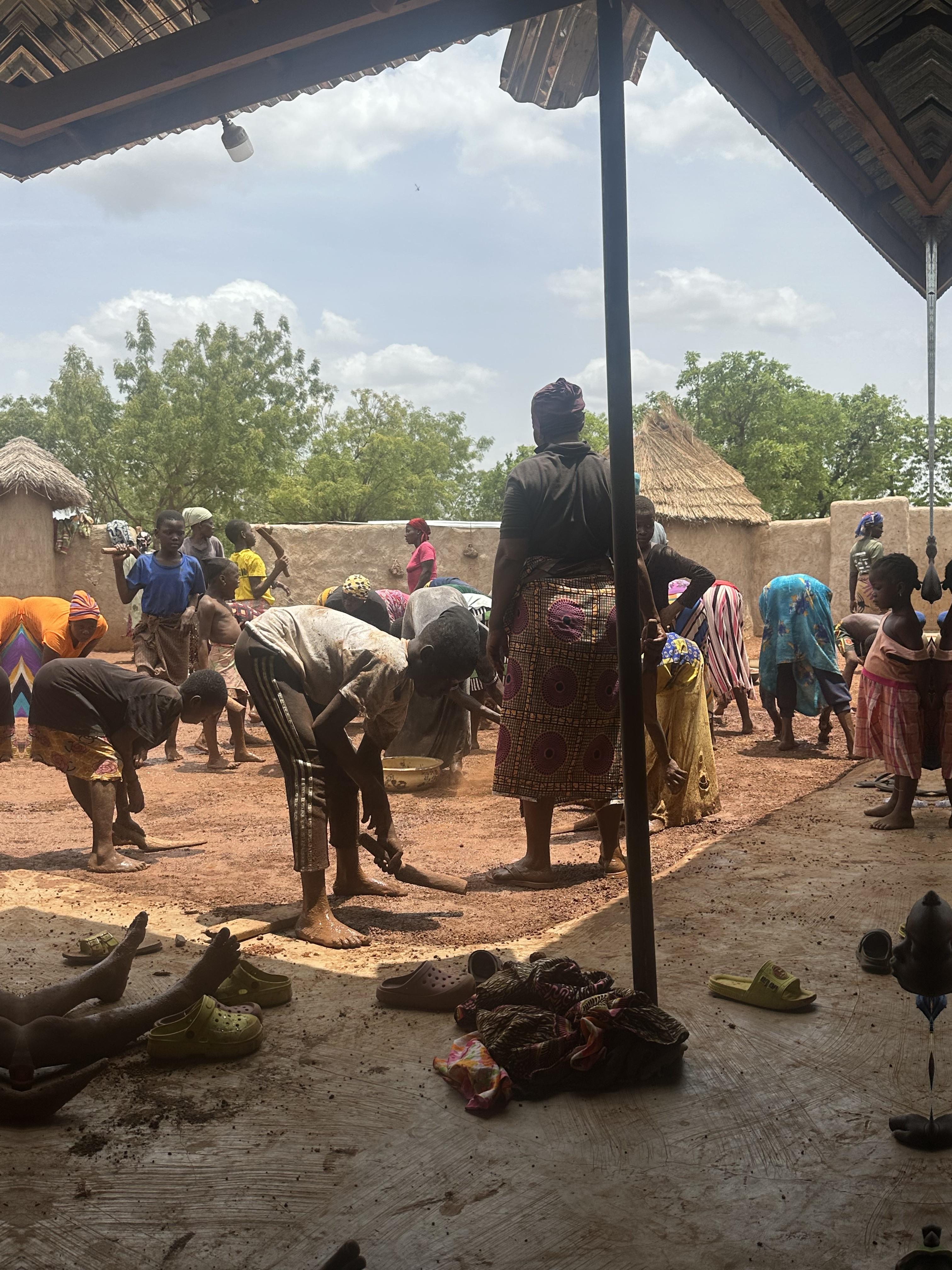 This is how the ground is made, the sand is wet and everyone helps slap it to make it hard