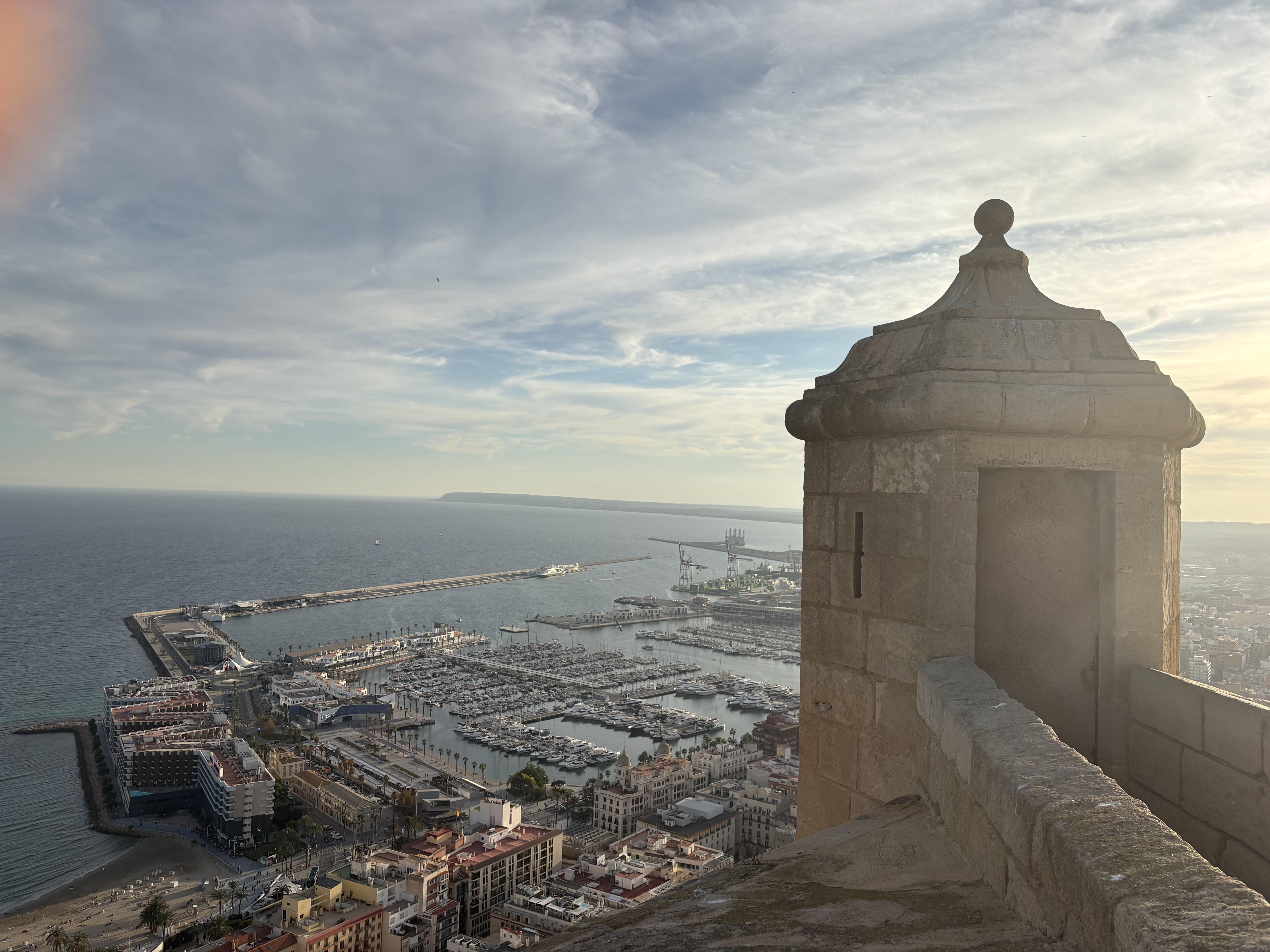 Además del lenguaje, la historia de la arquitectura en Alicante fue fascinante. Visitamos la cercana ciudad de Elche, patrimonio de la humanidad de la UNESCO con el bosque de palmeras más grande de Europa. Se llama el Palmeral de Elche. También hay un sistema de riego creado por los musulmanes hace muchos siglos. El sur de España está fuertemente influenciado por los asentamientos musulmanes. También visitamos el Castillo de Santa Bárbara. Los musulmanes estaban originalmente a cargo, y luego un príncipe conquistó el castillo el cuatro de diciembre, que ahora es el Día de Santa Bárbara. Las personas en países de Oriente Medio celebran este día también. Las cúpulas, los arcos y los minaretes, o torres, son símbolos de la arquitectura islámica que estaban presentes en el castillo.