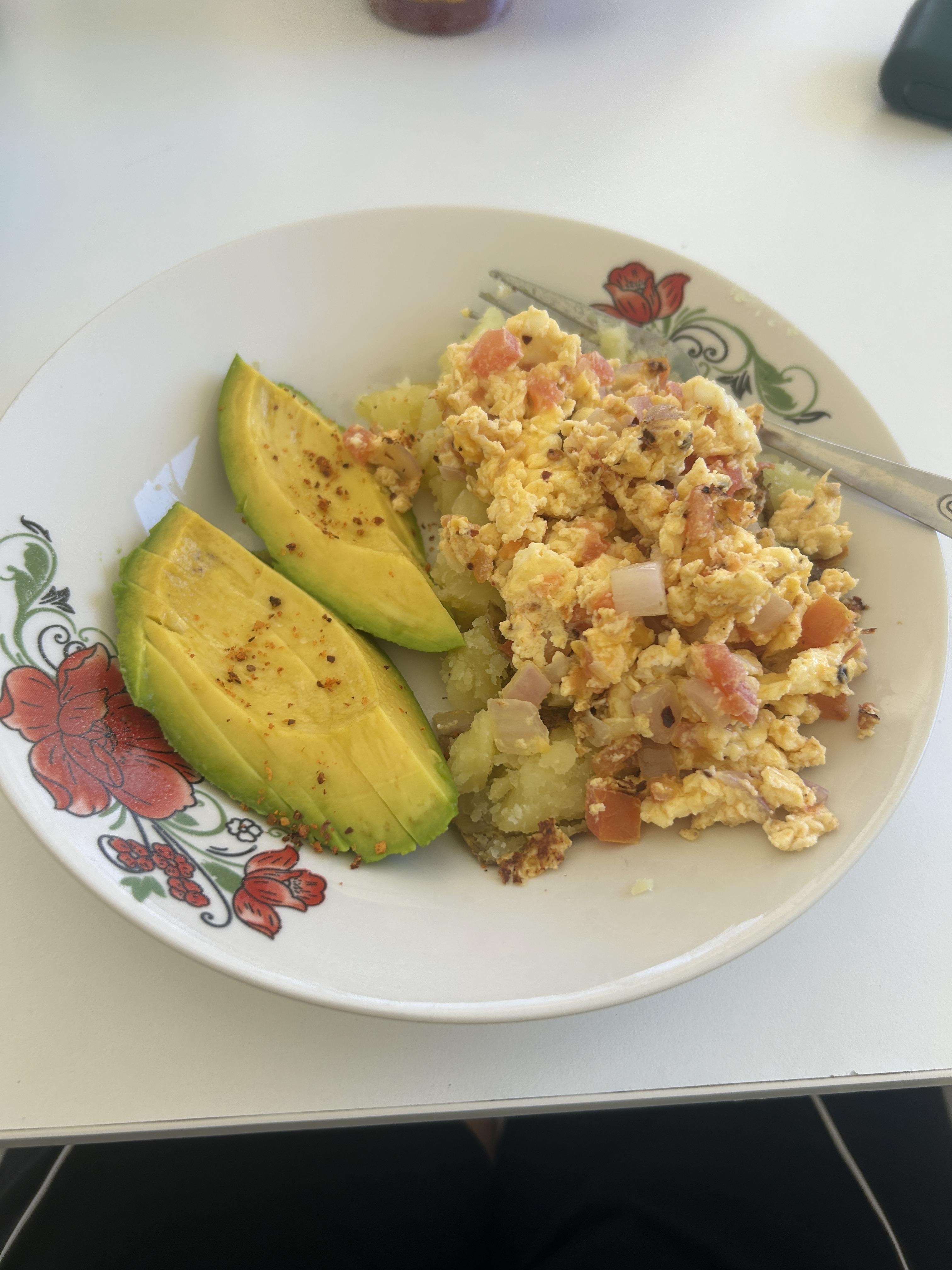 Esta semana comí huevos revueltos para el desayuno con vegetales. Con mi desayuno comí un aguacate fresco y tomé jugo de chinola (passion fruit). Los aguacates son muy comunes y frescos en mi pueblo, y me encanta añadirlos al desayuno.