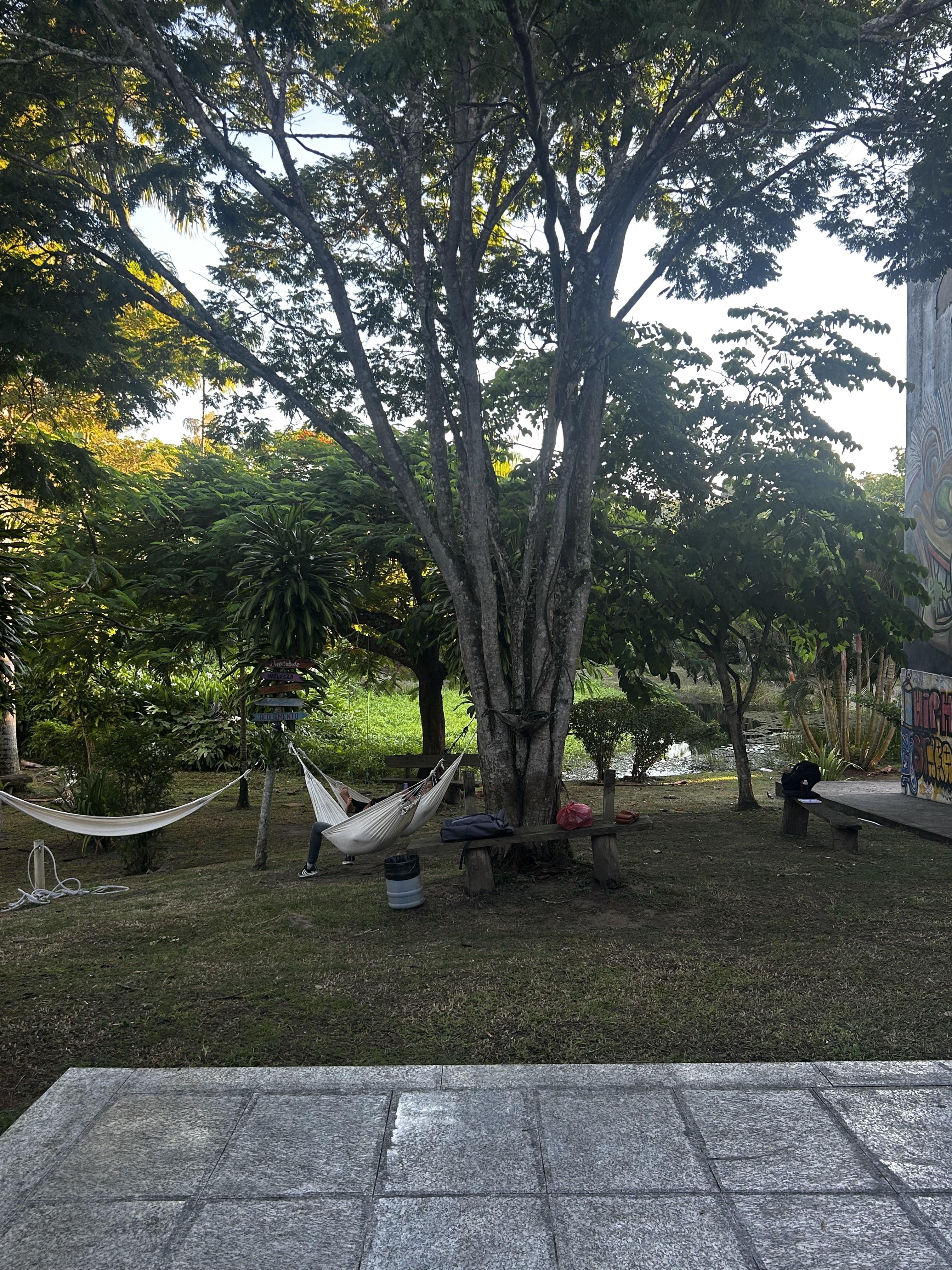 The campus is beautiful and full of nature; there is even a small lake that has cicadas buzzing and butterflies flying around! Next to the lake, there are trees where you can set up hammocks to read or hang out with friends in between classes. I will definitely be spending a lot of time here!