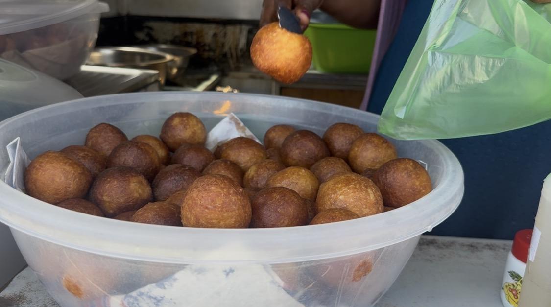 My favorite snack to buy in town is makoenya. Makoenya are very affordable and usually cost two rand or about 12 cents in U.S. currency. People sell them in small shops, or they carry them in large buckets on their heads as they walk around town.