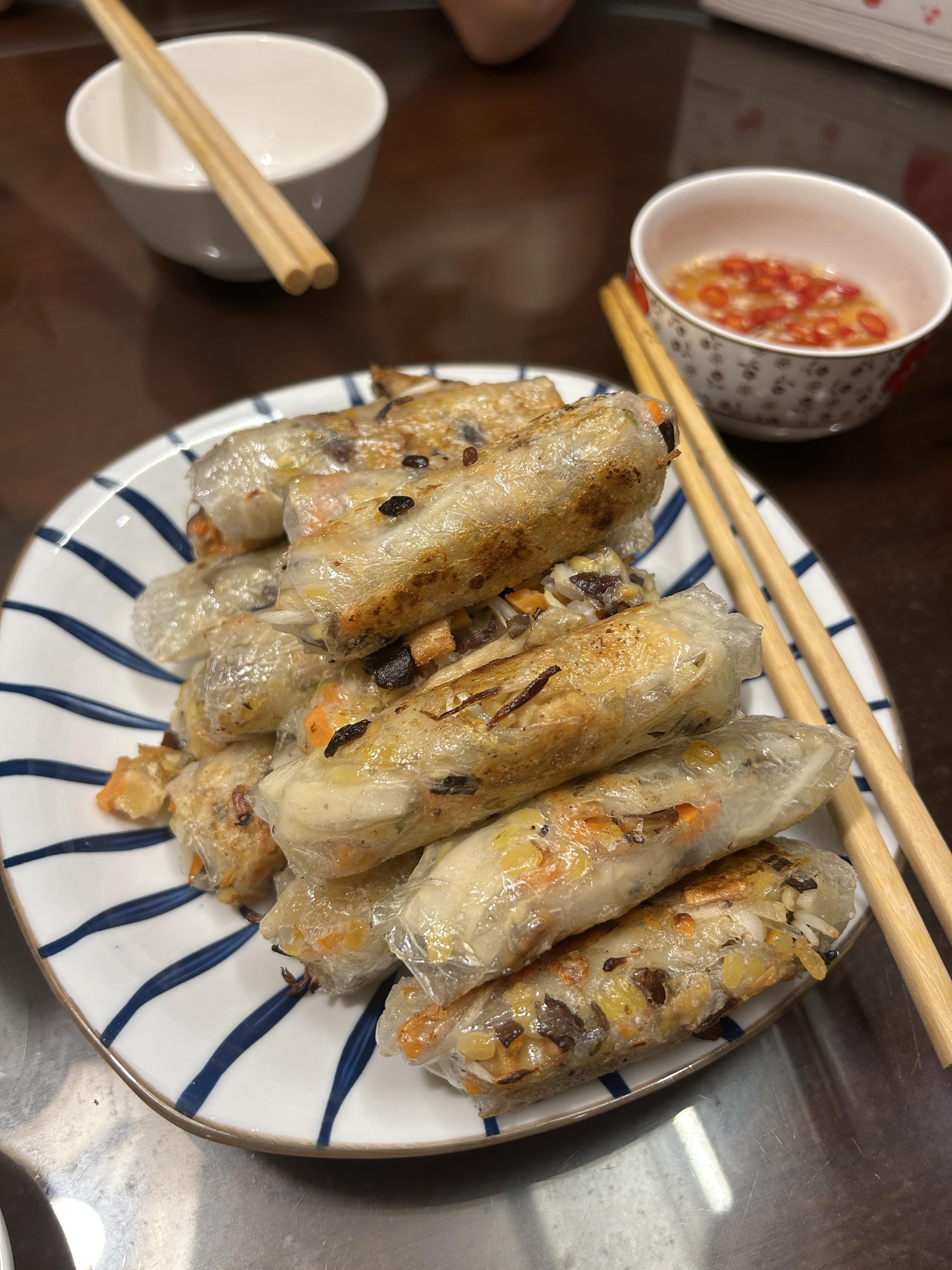 I tried nem rán, a traditional Vietnamese food often called “spring rolls” in English. Nem rán is made by wrapping vegetables, noodles and either pork or shrimp in rice paper wrappers. Nem rán is traditionally eaten to celebrate the Lunar New Year, the biggest holoiday in Việt Nam, but it is popular all year round! Because nem rán is traditionally eaten during celebrations, it represents family and good luck.