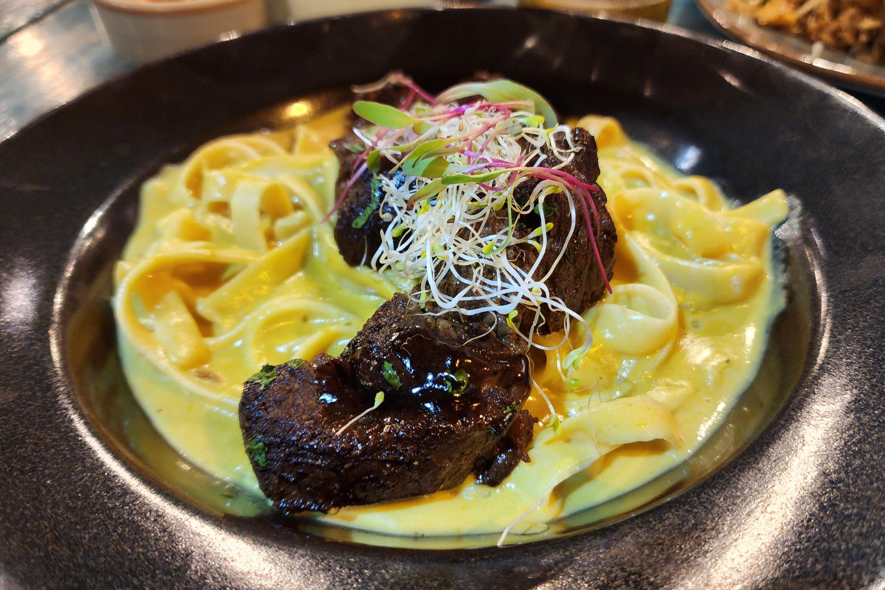 Mi plato favorito hasta ahora es el lomo y pasta a la huancaína. El lomo es un plato súper delicioso de tiernas tiras de solomillo marinado, que se sirve sobre la pasta a la huancaína. La pasta parece como fettuccine alfredo, pero en realidad está bañada en una suave (no picante) salsa huancaína hecho de ají.