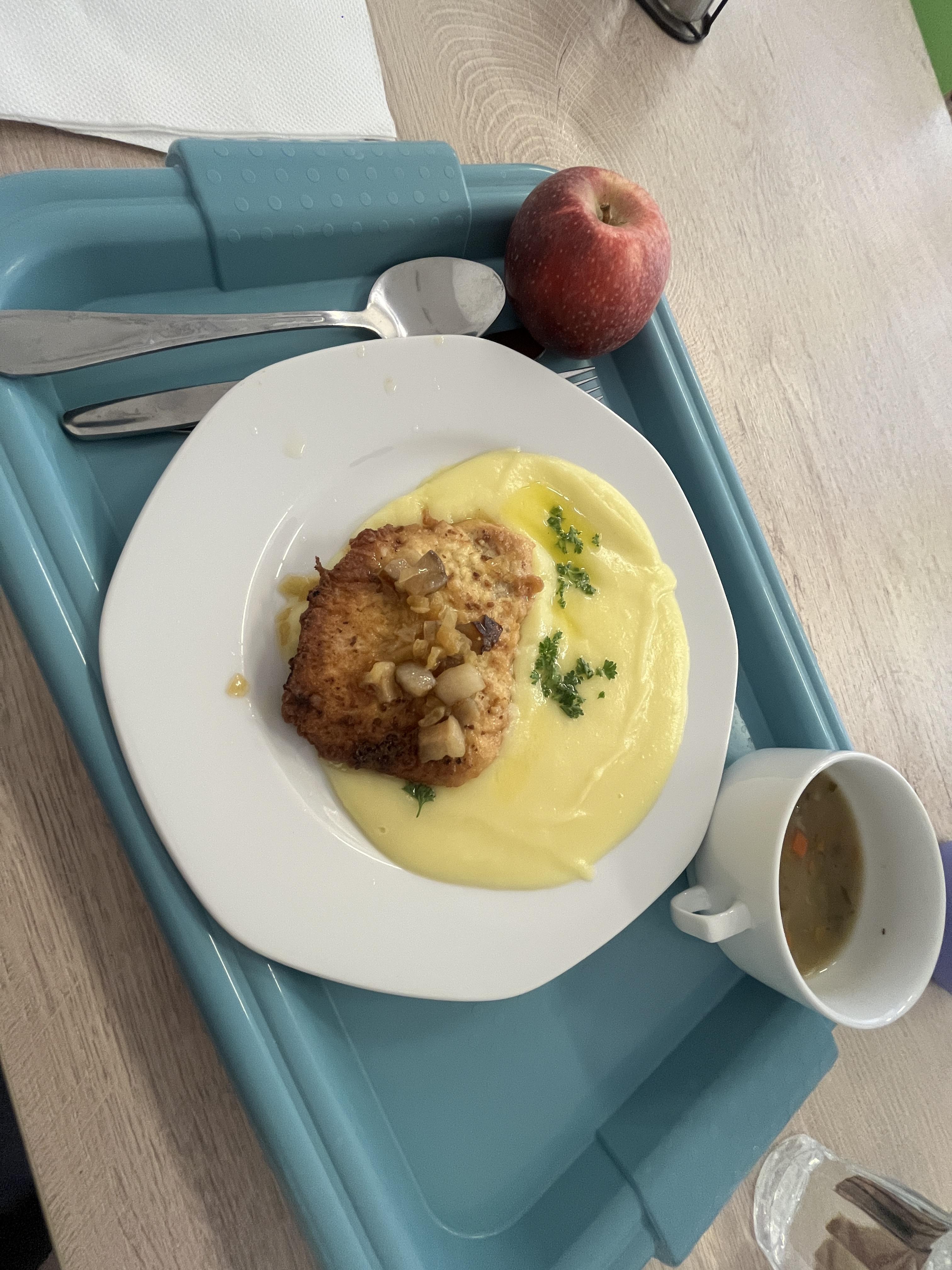 For lunch, I eat at the school canteen (cafeteria). There is always soup to start, and then the main meal is usually some kind of meat with vegetables.