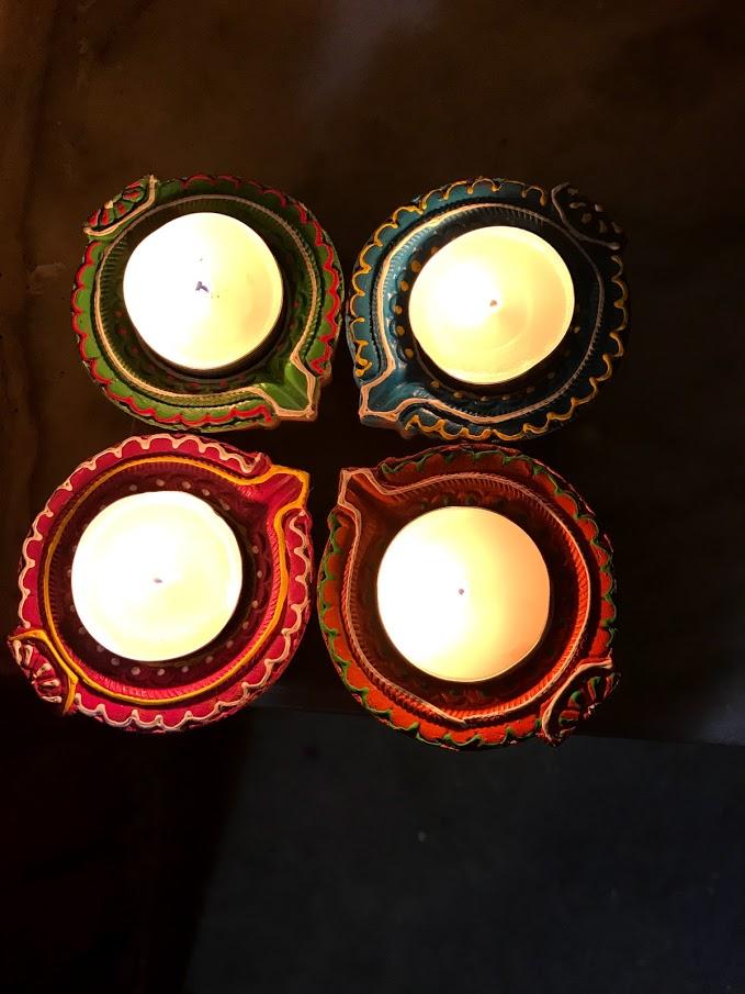 Diwali is celebrated with lots and lots of lights! Families will decorate their houses with strings of lights and diyas, which are candles in small bowls. Hema’s family put up lots of lights on the front of their house for Diwali. They even put lights inside their house to make it extra festive! Another way people celebrate Diwali is with fireworks. Families will light off big and small fireworks (or ‘crackers’ in India) on all nights of Diwali, but especially the third night. The city glows from the light of fireworks!