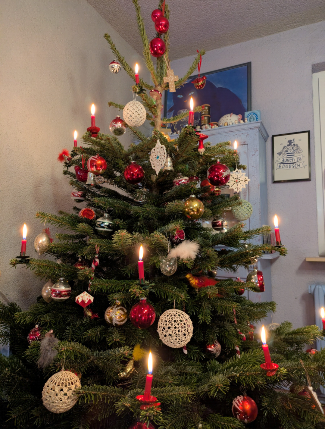 Here are the candles burning on a Christmas tree. As the candle wax runs out, they went out on their own. We did have to keep a close eye on it, though!