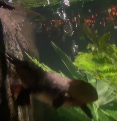 At the zoo, I saw a platypus! This animal is found in Australia. It was swimming in its exhibit, looking for food.