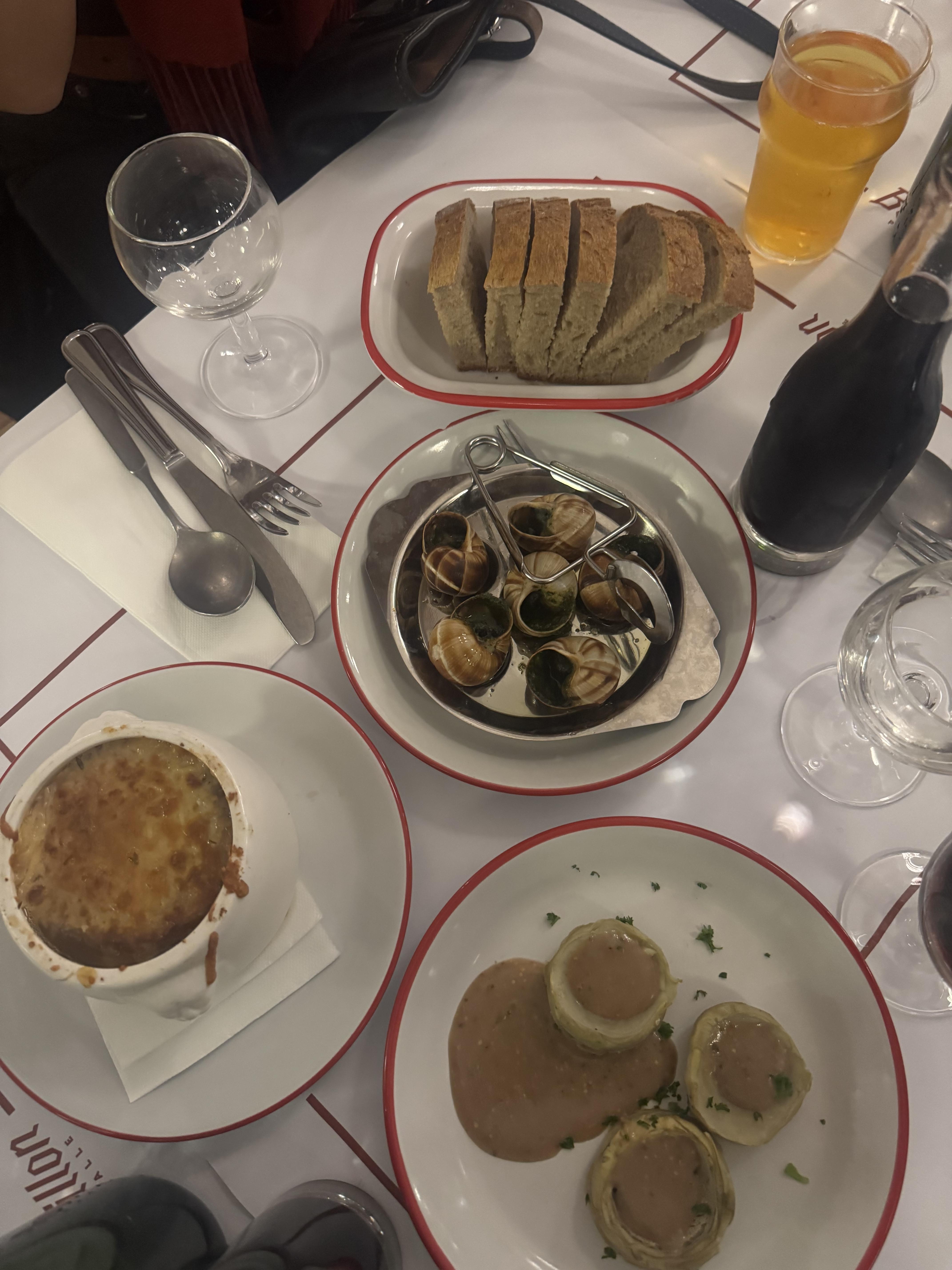In addition to French onion soup, I also had the opportunity to try other iconic French foods, including pain au chocolat, croissants, traditional baguettes and escargot. Each of these dishes offered a unique taste of French culinary heritage, from the flaky, buttery layers of a croissant to the rich chocolate filling of pain au chocolat. Escargot (snail) was the most adventurous, with its garlicky, buttery flavor giving me a true sense of French tradition and gastronomy. Before tasting the French onion soup, I felt curious and excited.