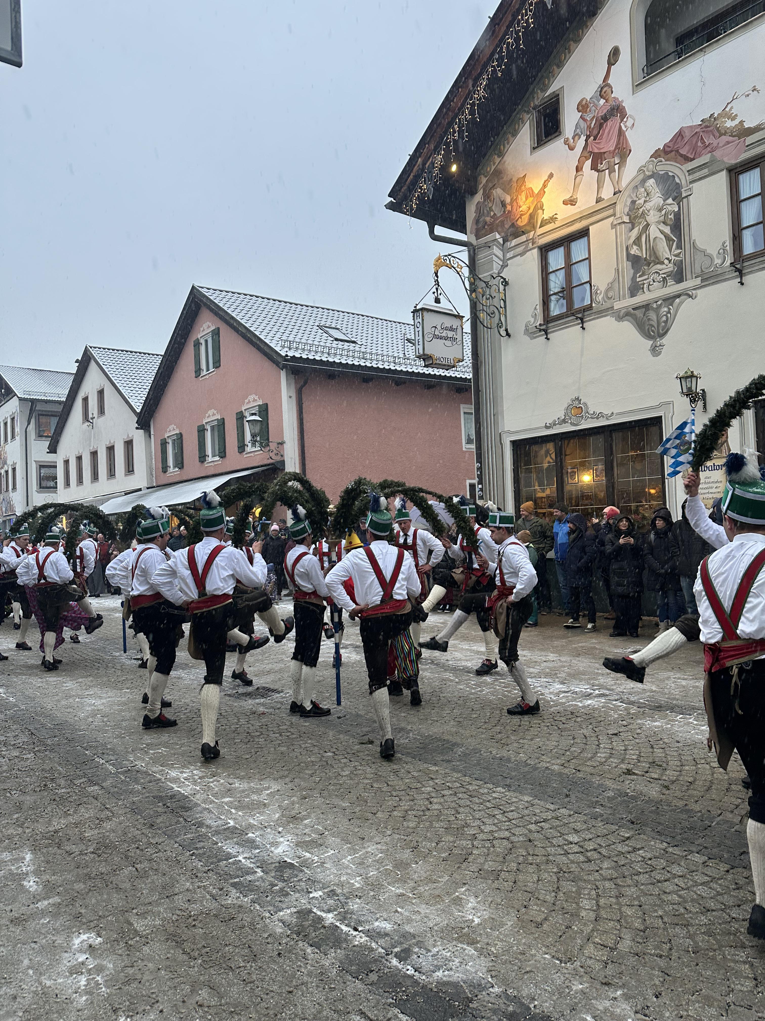 I saw a performance of a Schaffler dance (in German: Schäfflertanz) in the Munich area this week. The Schaffler dance is an old tradition in the southern parts of Germany that originated as a representative dance of coopers (barrel makers) in Munich. Originally, only unmarried, young coopers were allowed to participate. However, in recent years, these restrictions have relaxed. The dance involves a group of dancers in traditional costume making intricate figures symbolizing endurance of the Munich people through a great plague in 1517. The dance is only performed once every seven years.