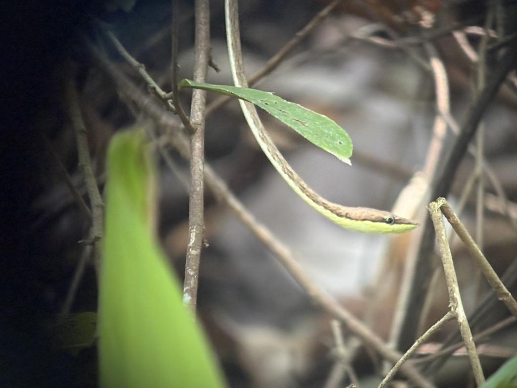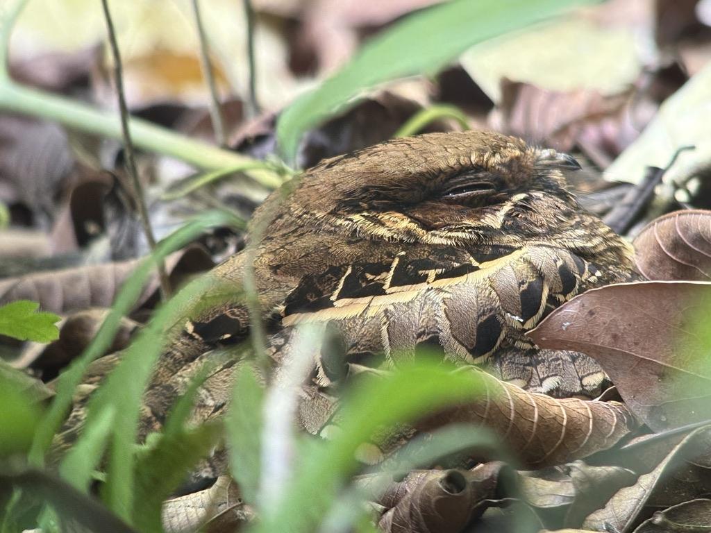 We saw some great examples of mimicry, including a bird called a Common Pauraque. This bird has feathers that look similar to the scales of a snake, so that predators will avoid it. There were also several frogs that blend in so well with the leaves and become almost invisible. We also saw and another tiny frog taking advantage of a tiny hole in the trunk of a tree. It was impressive that the guides were able to spot them!