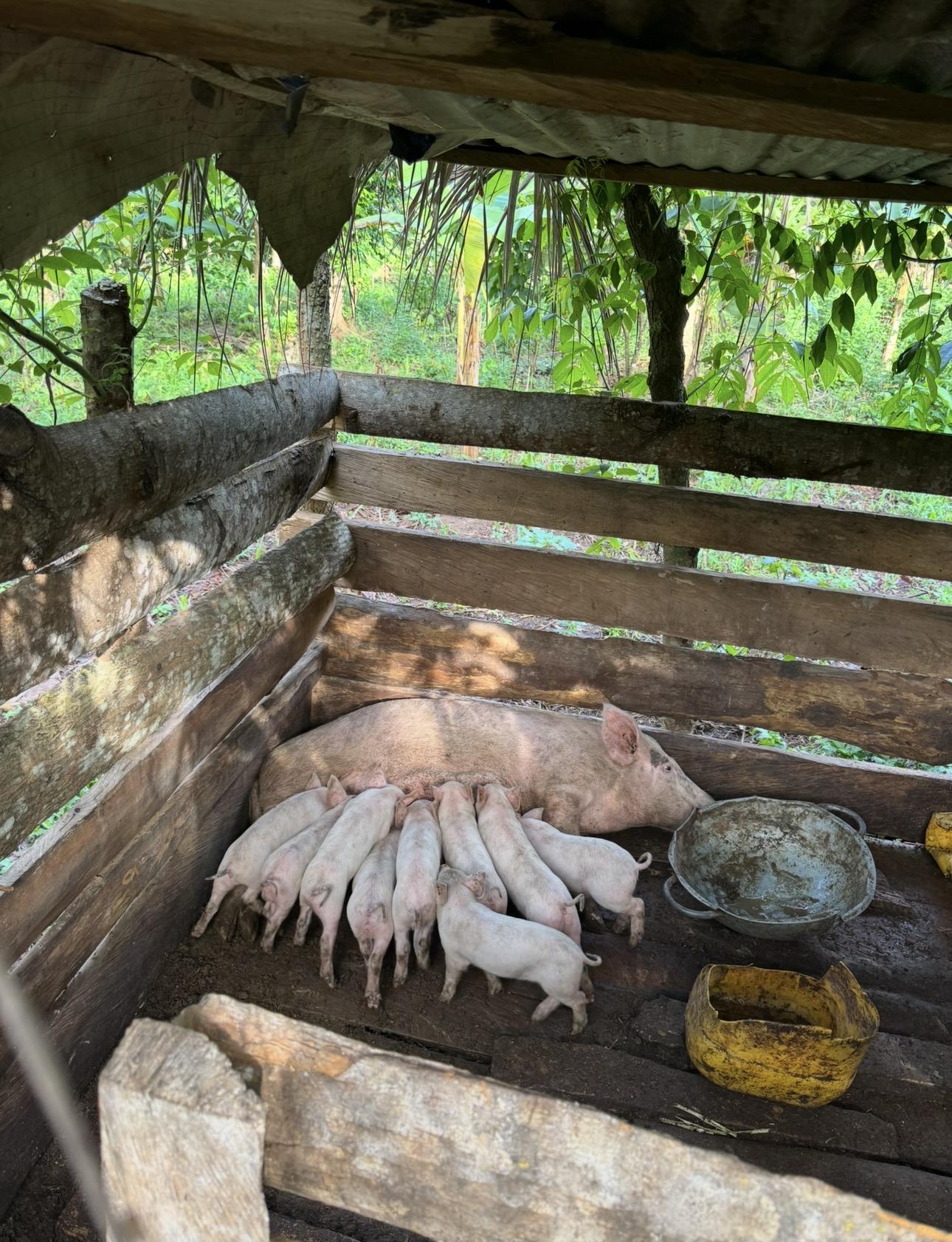 Pigs aren't super common, but some farmers have them. This mom (called a sow) recently gave birth in my village