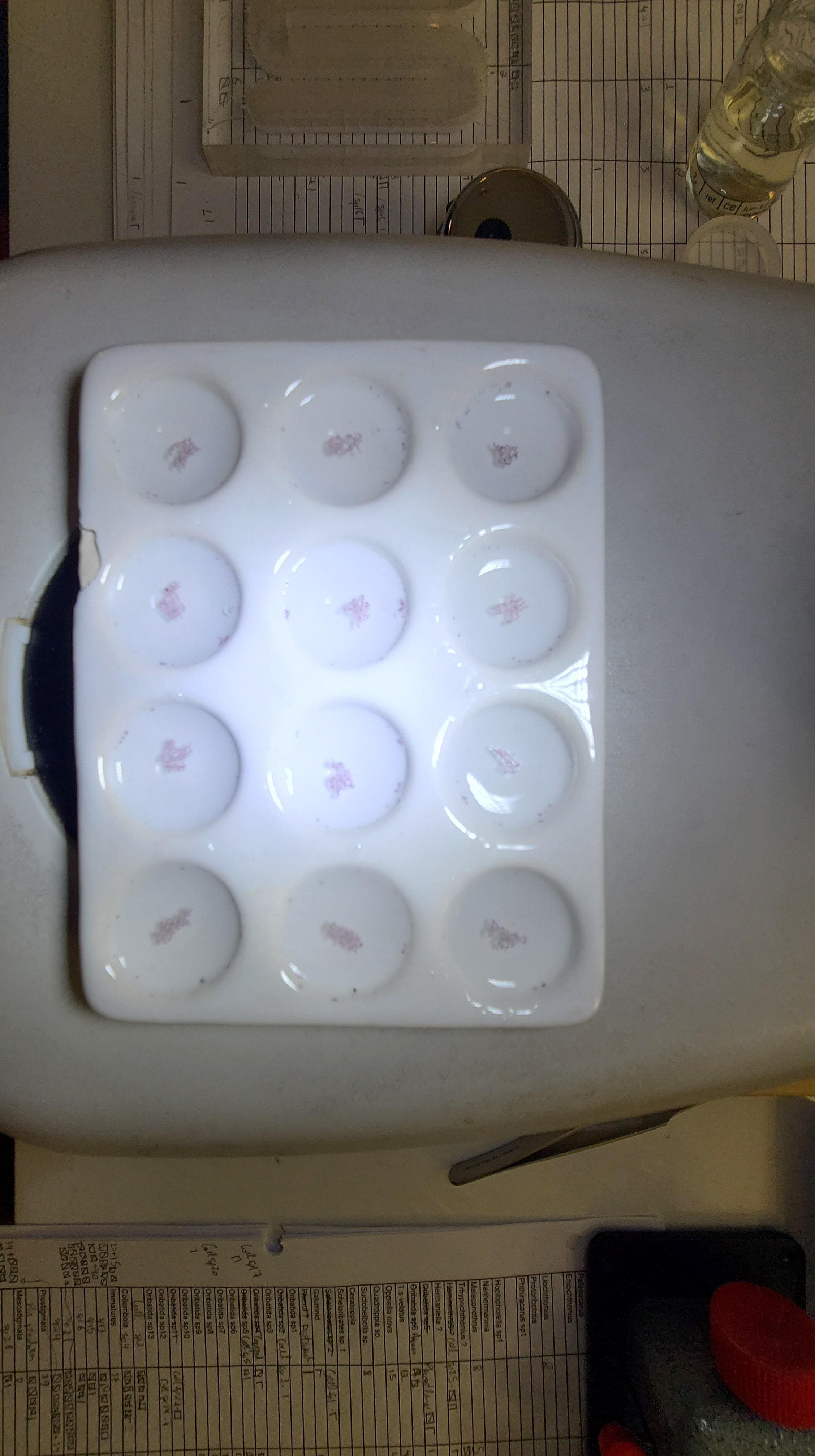 To use this second microscope, I need to prepare the individuals. This means getting an individual of oribatid mite of interest and putting it on a microscope slide. I use a chemical (not safe for children to use) to help highlight structures of its body under the light of the microscope. I can also use the camera attached to the microscope to take pictures. Did you see my first video call? There are lots of pictures of oribatid mites there too!