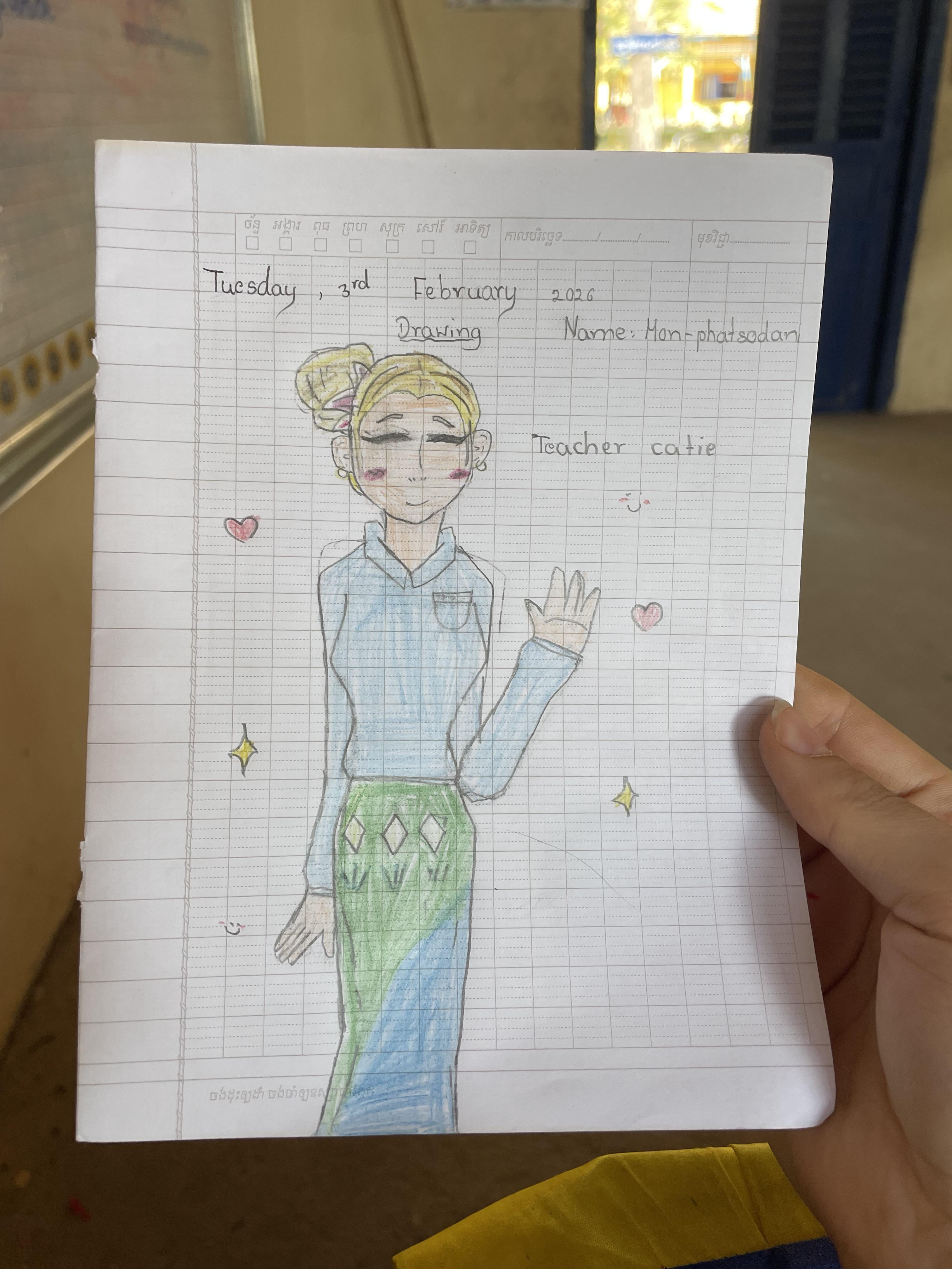 These activities help me relax after teaching and stay balanced. Drawing and reading allow me to slow down and reflect. Working out helps me stay healthy and energized. Spending time with family often includes talking, eating together, or simply sitting and sharing space. Free time here looks different than it did in the US. It is quieter and less scheduled. I’ve learned to appreciate slower moments and simple activities.