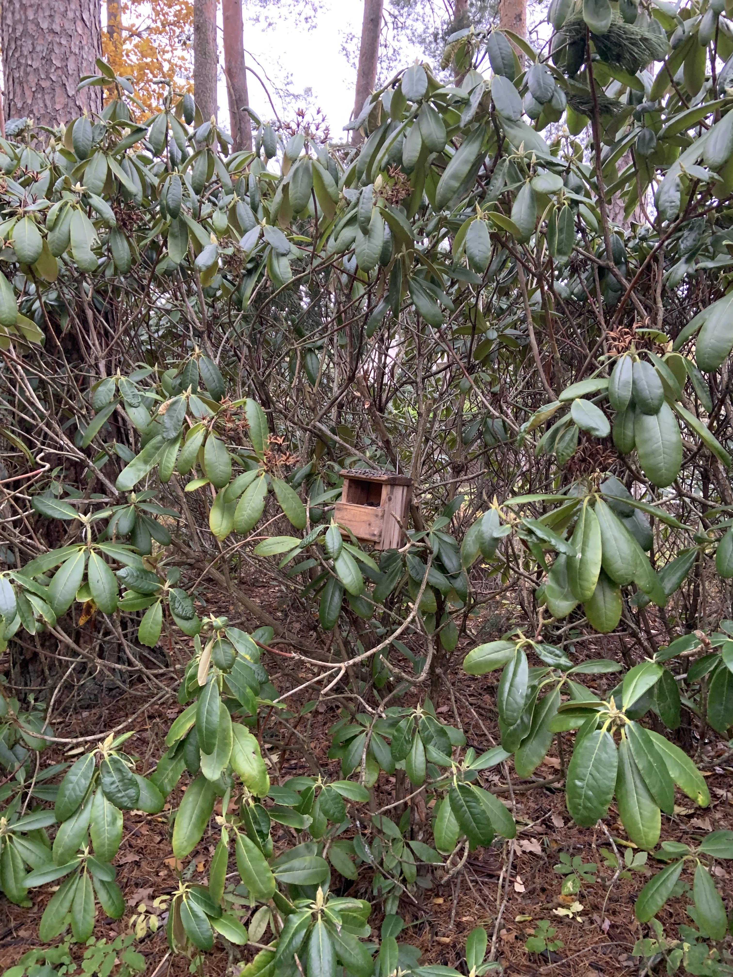 For this study, we have relocated half of our feeders so that they are close to their original locations but obscured by denser vegetation. For instance, a feeder may have been very exposed on a tree trunk, but we have now moved it into a patch of evergreen rhododendron. We stock a feeder with seed and wait for birds to approach.