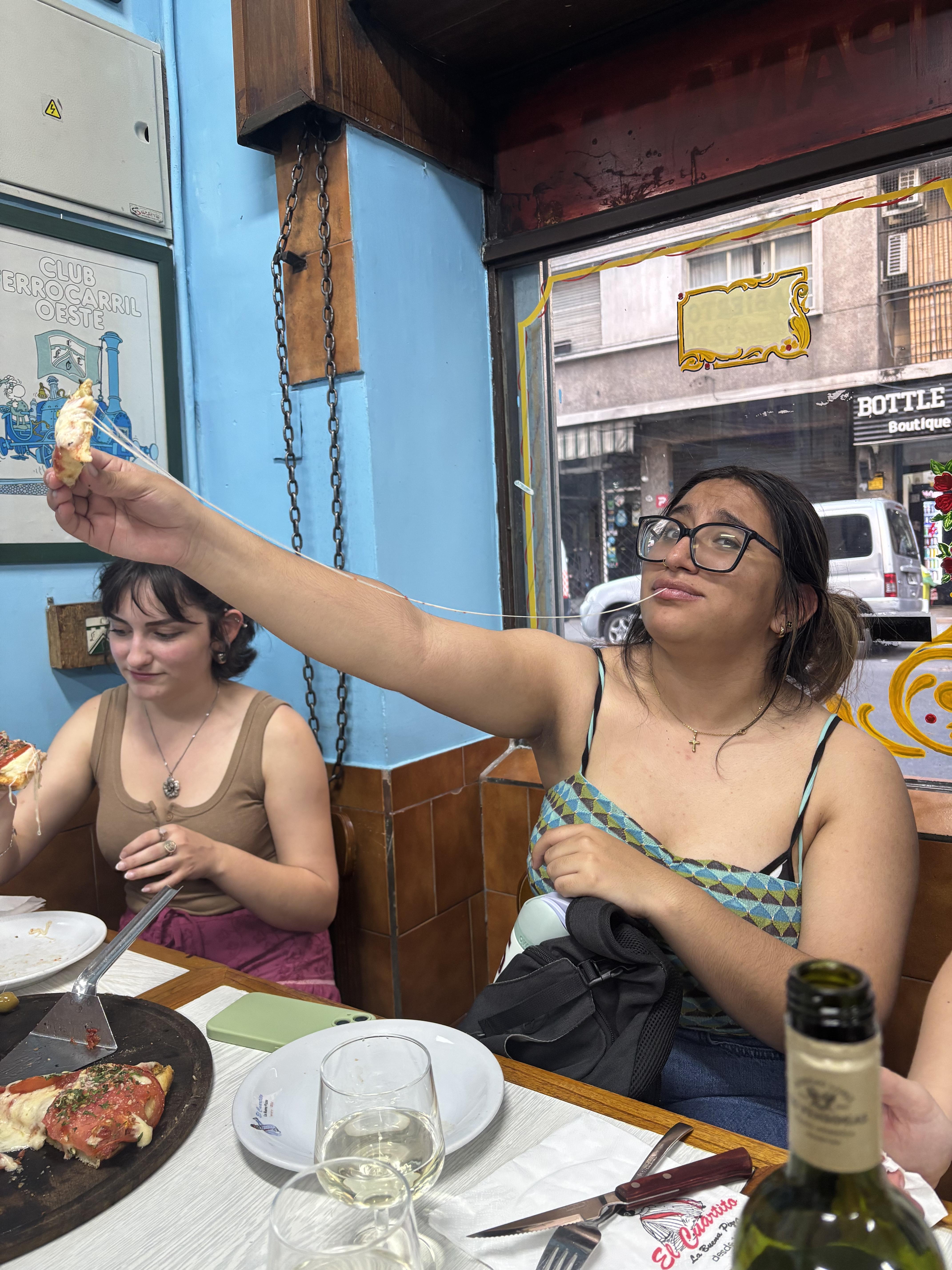¡Hola a todos! Ya completé mis primeras semanas en Buenos Aires y me ha encantado explorar la gastronomía que ofrece esta ciudad. Mucha de la población de aquí son descendientes de inmigrantes europeos entonces hay muchas opciones para comer. Buenos Aires es una ciudad muy transitable. Puedes caminar a casi todas tus destinos o usar el Subte (el metro subterráneo de Buenos Aires) o bus. Yo uso mucho la línea B del Subte porque me lleva directamente de Villa Crespo, el barrio donde yo vivo, a Recoleta, donde está CIEE. Cuando voy a tomar mis clases en CIEE, me bajo en la parada Uruguay. Desde ahí, camino 10 minutos y paso por unos cafés muy ricos. Mi café favorito es un lugar llamado Flamingo. Hace un latte delicioso y tiene unas galletas con chispas de chocolate muy exquisitas. Recientemente, fui con amigas a una famosa pizzería llamada El Cuartito. Está muy cerca de CIEE, solo caminamos como tres minutos. Adentro tenían fotos y camisetas firmadas por futbolistas argentinos famosos. También tenían colgados premios que había ganado en el pasado por la calidad de su pizza. Era un restaurante muy vivo y alegre, con música y mucha gente hablando y riendo.