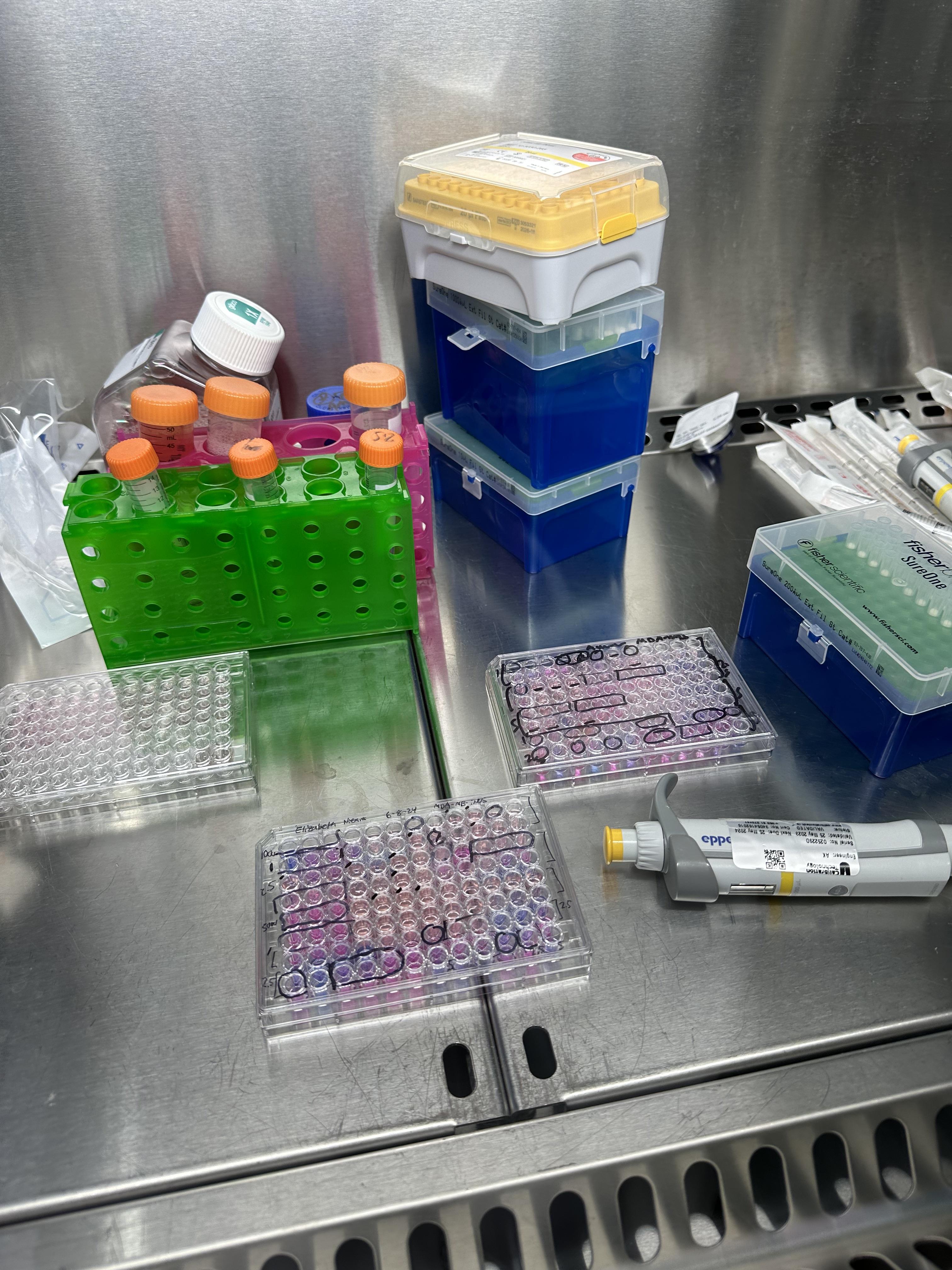 Although I typically have at least two flasks of 2.D. cells in the incubator at any time, most of the cellular work that I do in the lab is in 3.D. Growing cells in 3.D. is much different than 2.D! When performing experiments with spheroids, I culture cells in 96-well ultra low adherence plates. By seeding cells in 96 separate wells, I am able to test several different conditions at a time. The ultra low adherence plates are used so that the cells are not attracted to the plate, and instead group and adhere together in a sphere. I seed cells in each well at a cell density of at least 10,000x less than what I seed in flasks. For this reason, cell growth and proliferation happen at slower rates in a well compared to in a flask. I do not have to perform typical “cell passaging” for my 3.D. cells. Instead, I just remove the old media and exchange it to replenish nutrients. I exchange media every other day to every three days, depending on the length of the experiment.