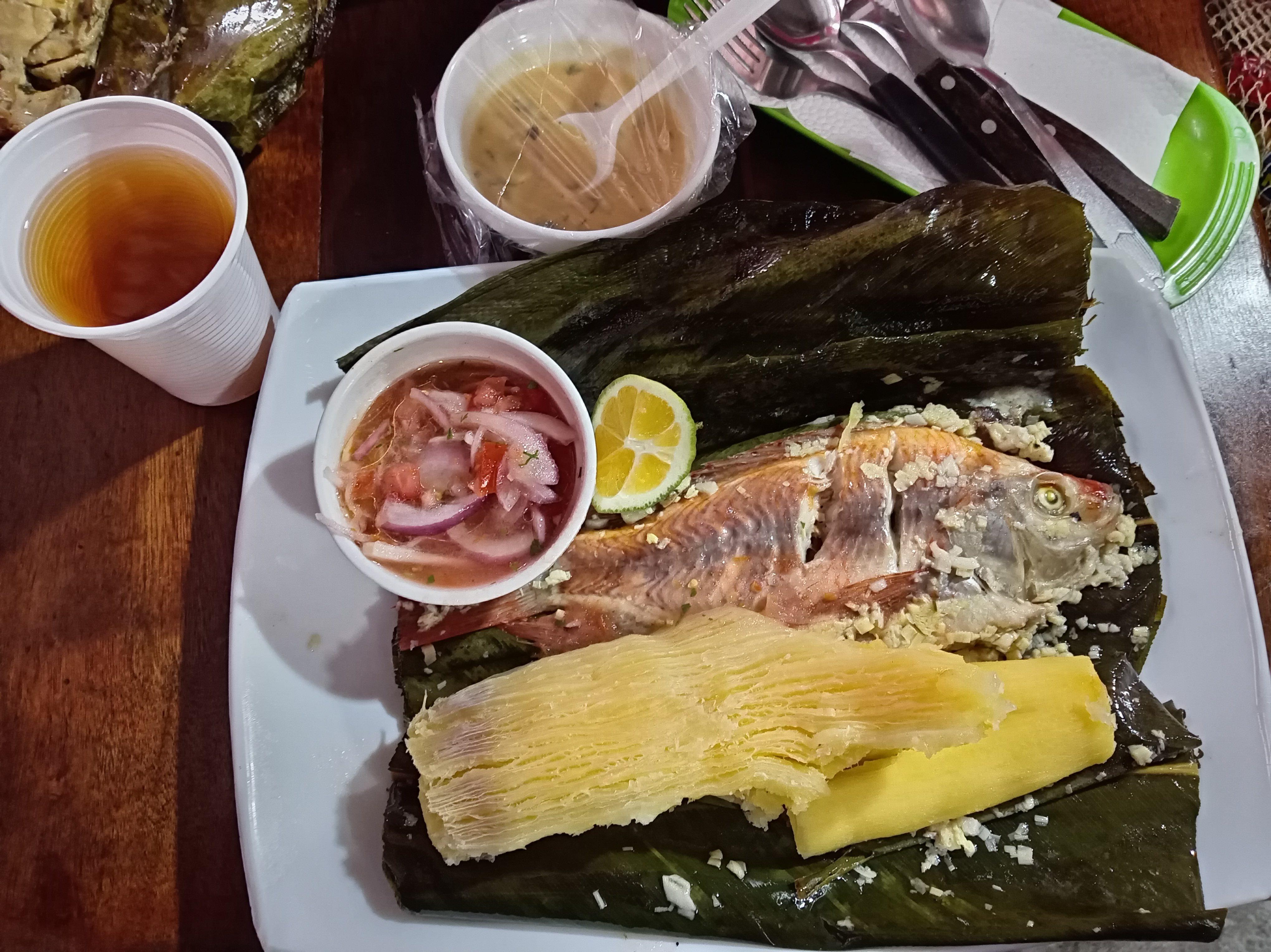 The best meal this week was tilapia! There is a special preparation of tilapia in the Amazon region called "maito", where the fish is marinated a yummy, garlicky sauce, wrapped in a special leaf and steamed until ready. Steamed "yuca" (a type of starchy root) and a salad of onion and tomatoes is served on the side. This meal also came with free, warm tea called guayusa. It is sweet and slightly cinnamon-y.